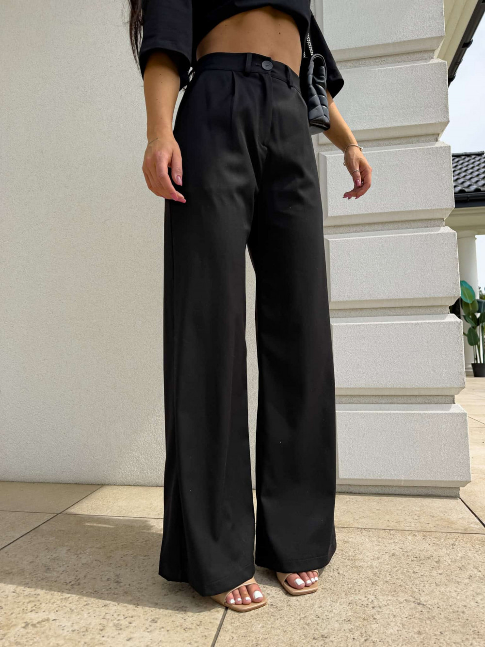 Spodnie SIMPLE idealnie podkreślają figurę oraz pięknie wydłużają nogi. Zapinane na guzik. Posiadają szlufki.Wykonane z gładkiego, lekko elastycznego materiału, który pięknie układa się na sylwetce. Posiadają wysoki stan, lekko zwężane nogawki i kryty zamek, co sprawia, że świetnie modelują talię i wysmuklają nogi.Minimalistyczny fason bez zbędnych dodatków sprawia, że pasują zarówno do szpilek, jak i sportowych butów. To doskonała baza do stylizacji na co dzień, do pracy lub na wieczorne wyjście.