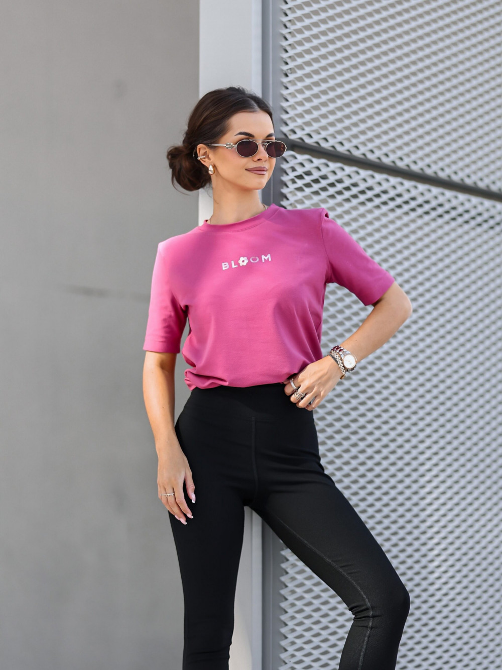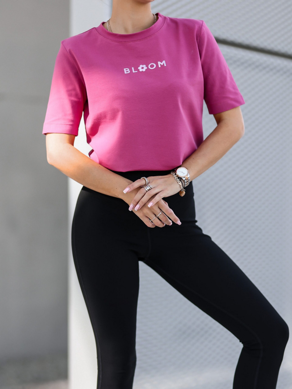 Stylowa koszulka damska w odcieniu malaga (głęboki, winny fiolet). Wykonana z wysokiej jakości bawełny, przyjemnej w dotyku i komfortowej w noszeniu. Z przodu nadrukowany napis Bloom nadaje całości kobiecego i pozytywnego charakteru. Klasyczny krój z okrągłym dekoltem sprawia, że to idealna baza do codziennych stylizacji.