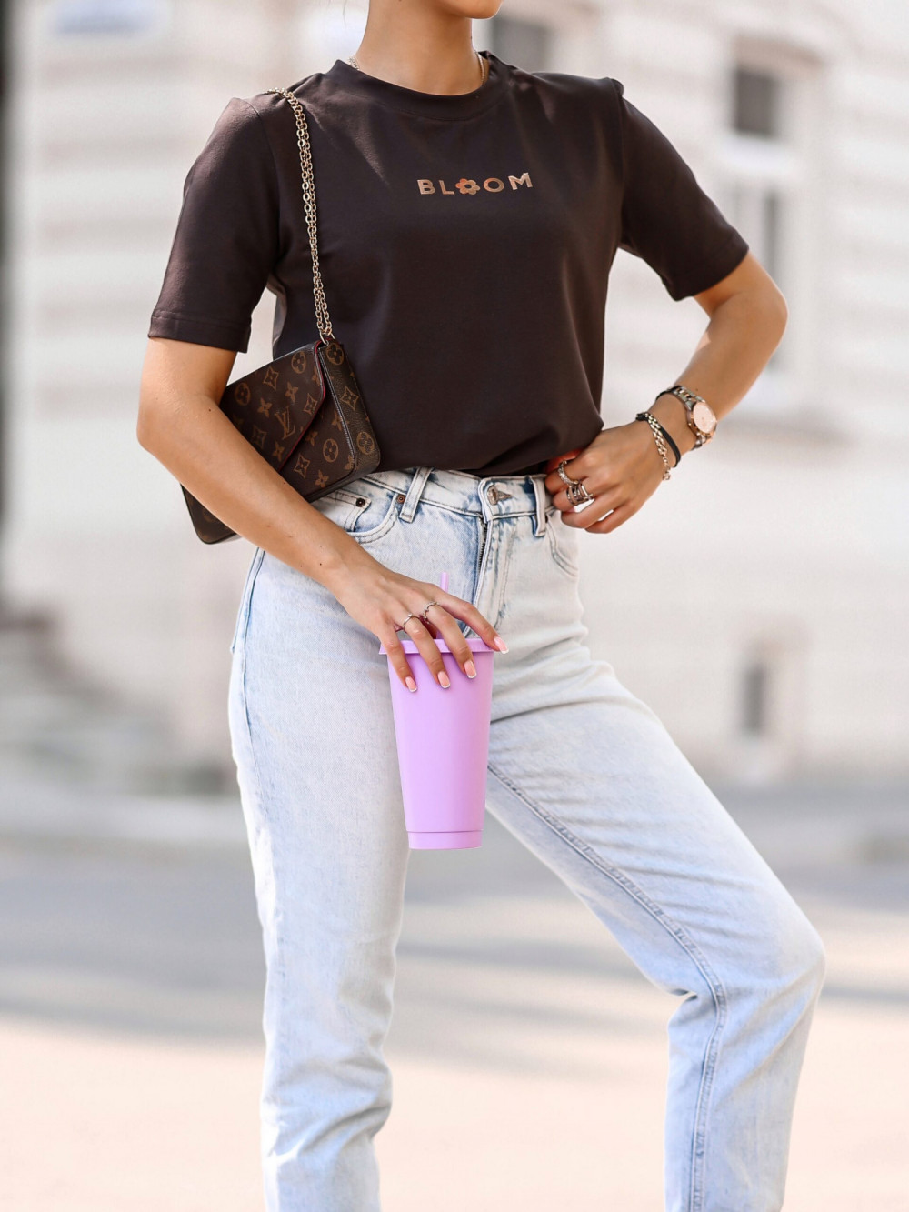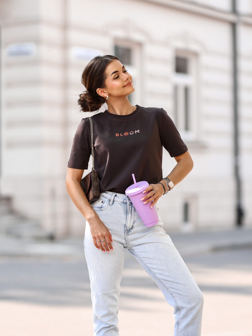 Stylowa koszulka damska w odcieniu brązu. Wykonana z wysokiej jakości bawełny, przyjemnej w dotyku i komfortowej w noszeniu. Z przodu nadrukowany napis Bloom nadaje całości kobiecego i pozytywnego charakteru. Klasyczny krój z okrągłym dekoltem sprawia, że to idealna baza do codziennych stylizacji.
