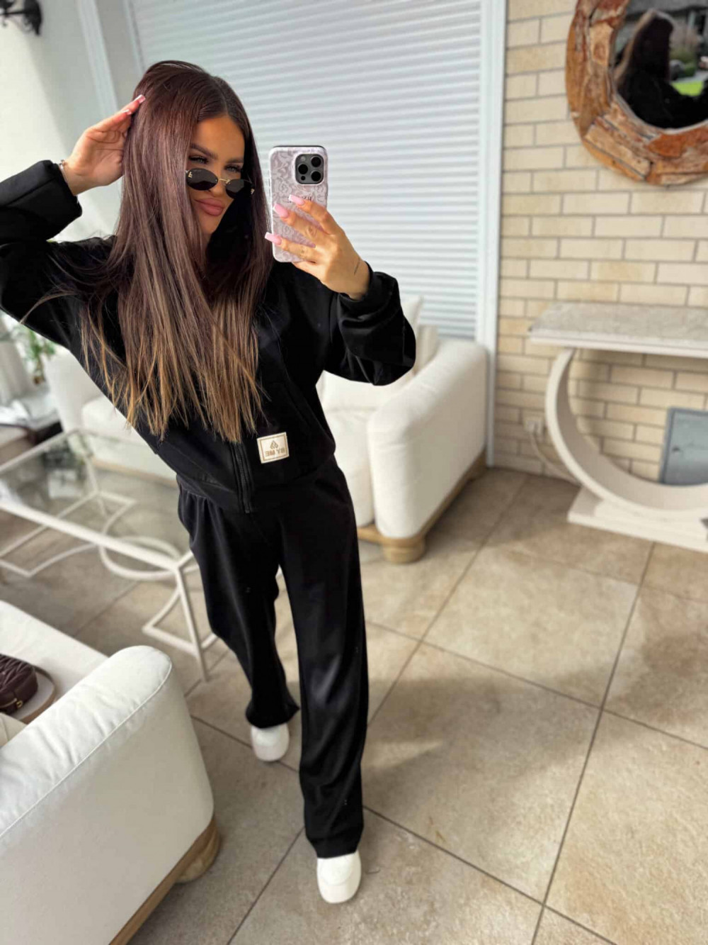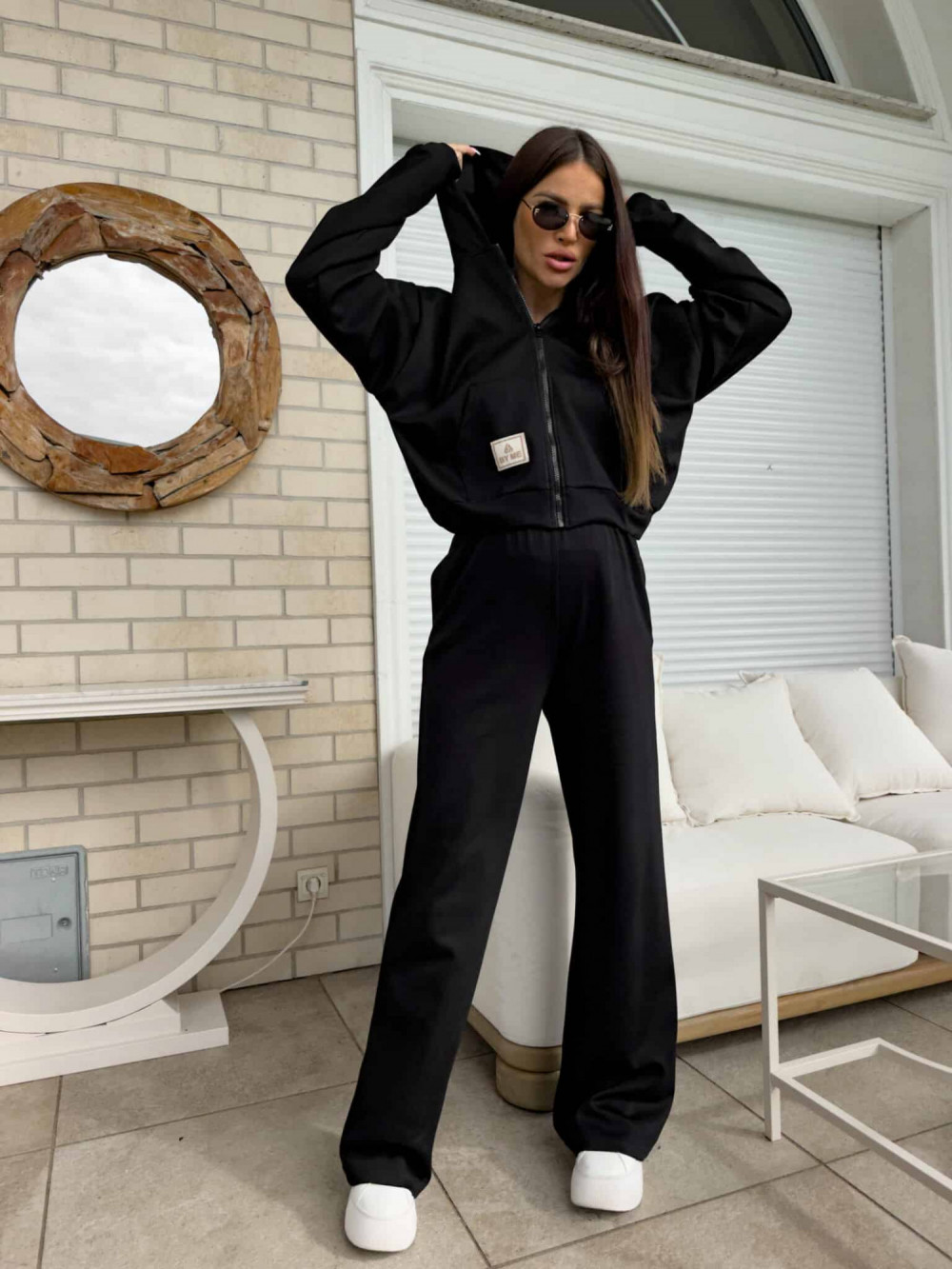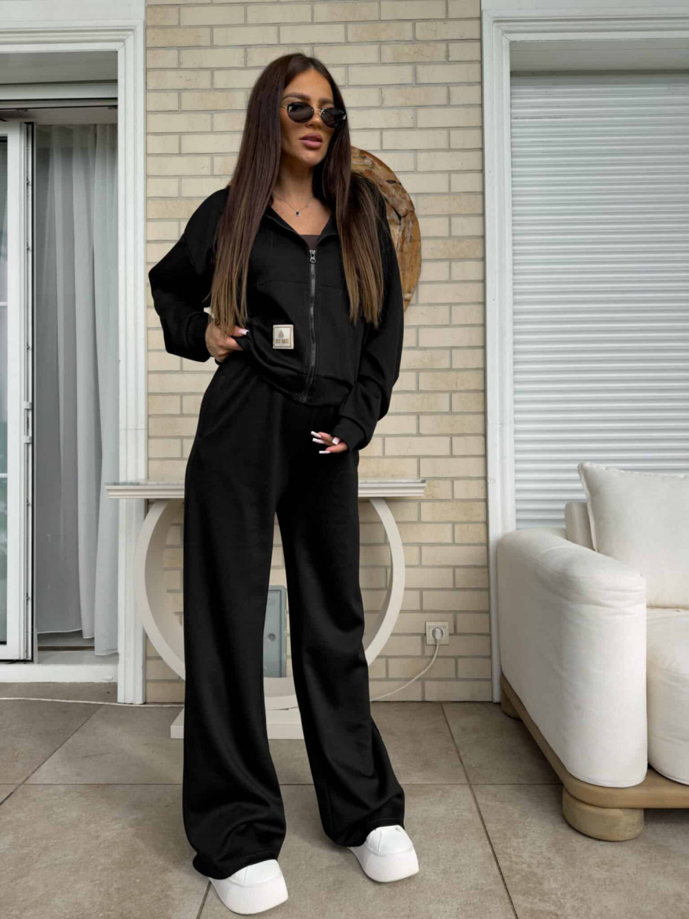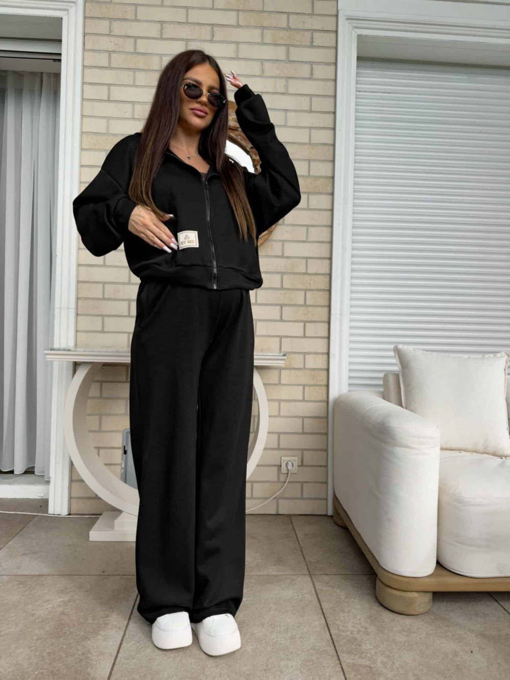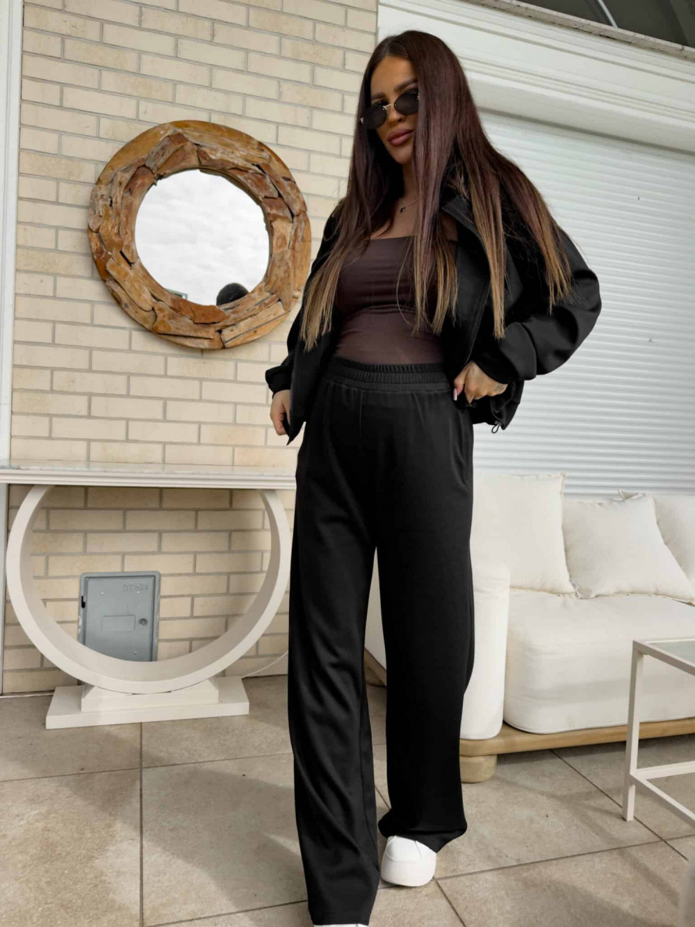 Wygodny komplet dresowy składający się z bluzy i spodni. Bluza zapinana na zamek, z długimi rękawami i lekkim, oversize’owym krojem. Spodnie dresowe z wysokim stanem i szeroką gumką w pasie zapewniają idealne dopasowanie i komfort noszenia. Proste, lekko rozszerzane nogawki nadają całości swobodny, nonszalancki look.