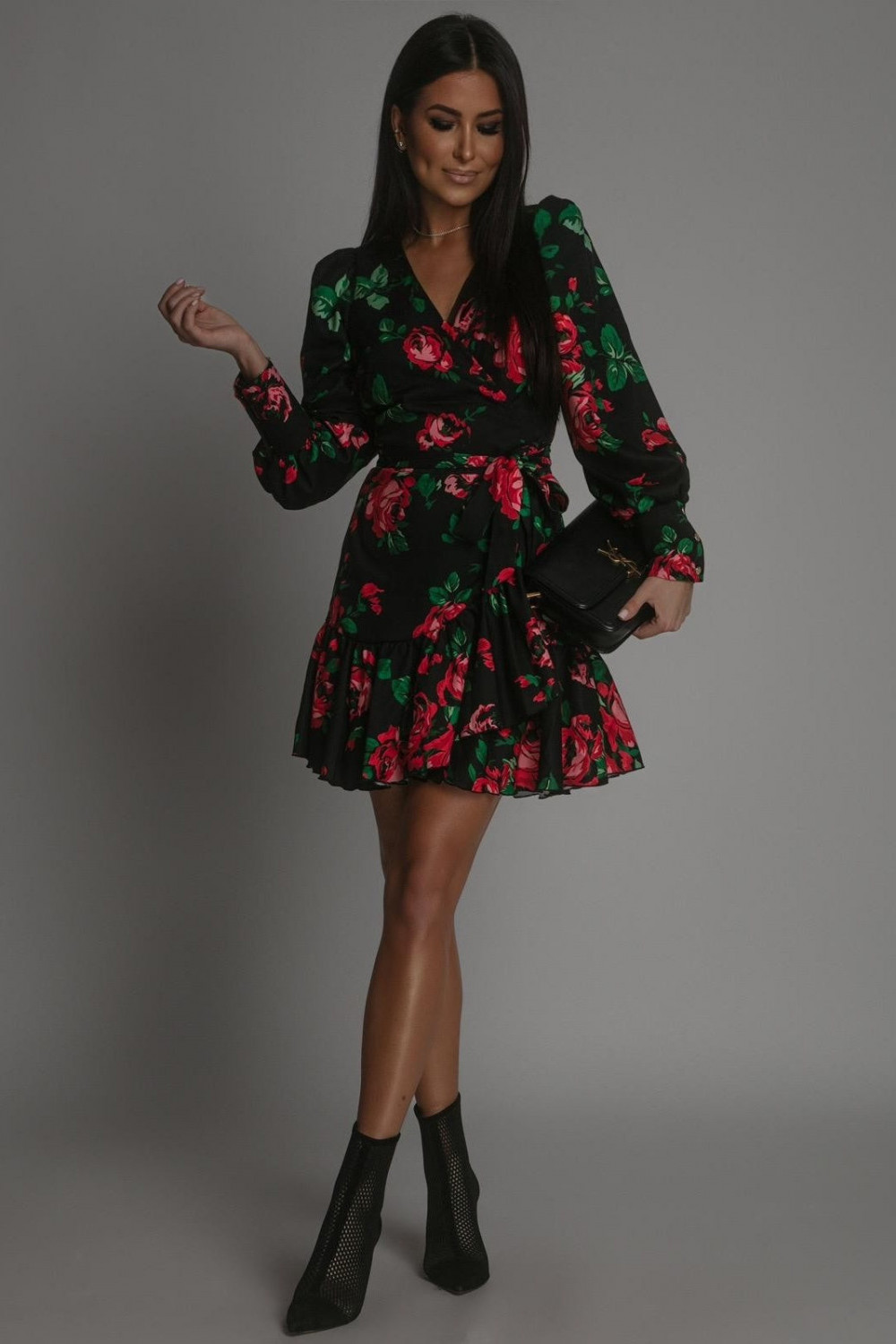 Zjawiskowa sukienka o kobiecym kroju, która idealnie podkreśla sylwetkę. Wykonana z lekkiego, przyjemnego w dotyku materiału, ozdobiona efektownym kwiatowym printem w odcieniach różu i czerni. Kopertowy dekolt subtelnie eksponuje dekolt, a delikatne wiązanie w talii pięknie modeluje figurę.