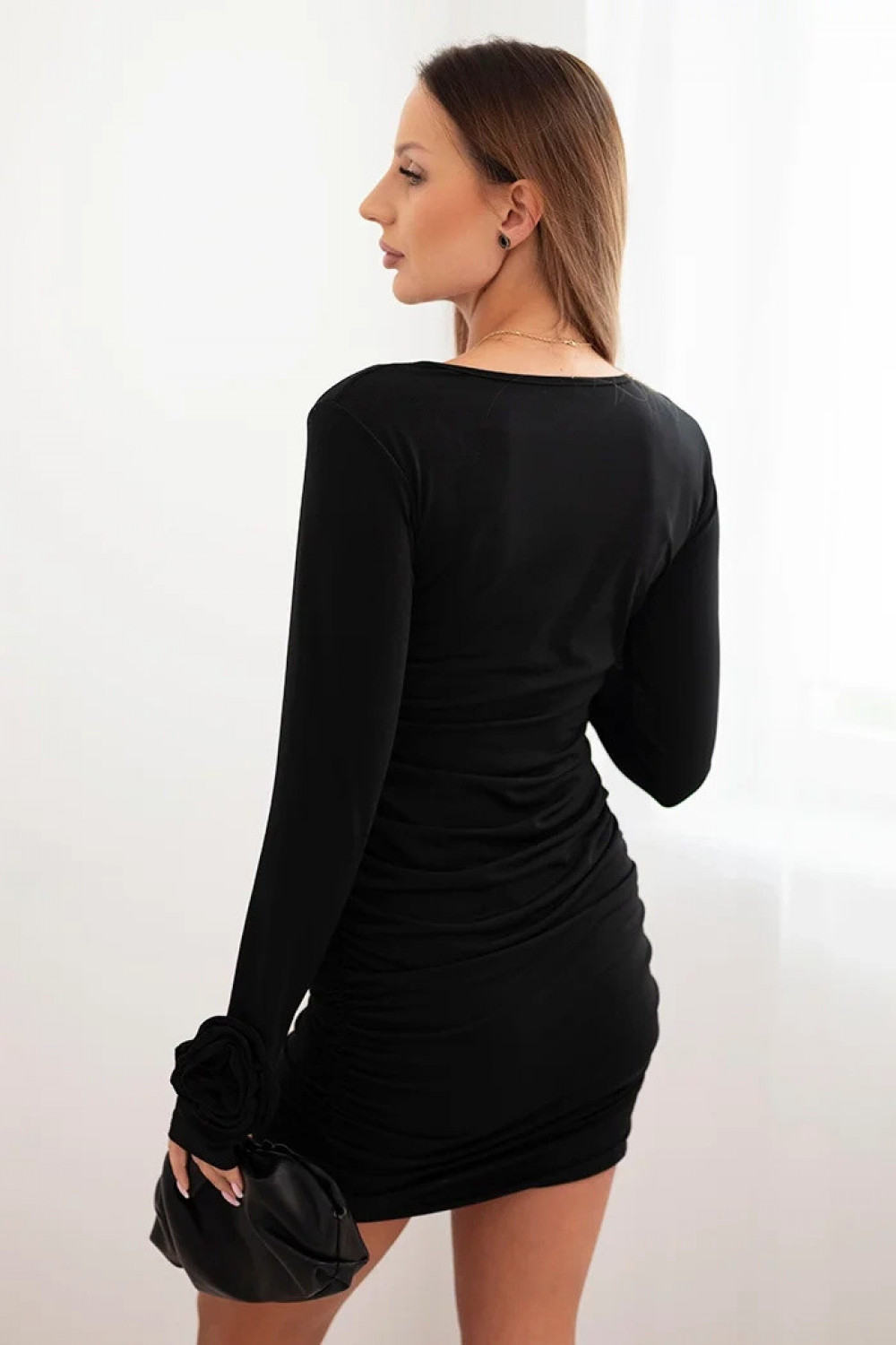Elegancka sukienka damska mini wykonana z elastycznego materiału z dodatkiem wiskozy to idealna propozycja na wyjątkowe okazje. Klasyczny krój z długim rękawem został urozmaicony efektownym marszczeniem na całej długości oraz dekoracyjnymi kwiatami na mankietach, które dodają kobiecego uroku.Materiał pięknie układa się na sylwetce, podkreślając kształty i zapewniając pełen komfort noszenia. To doskonały wybór na randkę, imprezę, kolację lub świąteczne spotkanie – kobiecy, wyrazisty i wygodny zarazem.