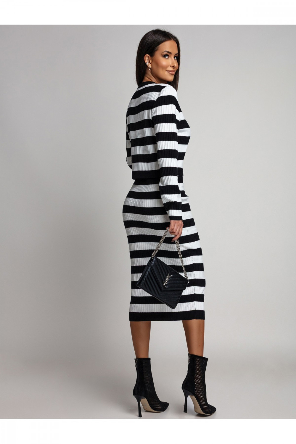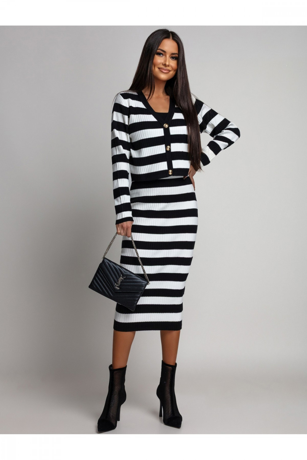 Wyjątkowy dwuczęściowy komplet, który łączy kobiecy styl z ponadczasową klasyką.Prążkowany materiał pięknie przylega do sylwetki, podkreślając kształty, a poziome pasy dodają charakteru i nowoczesnego looku.
