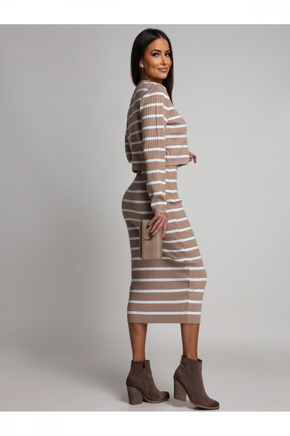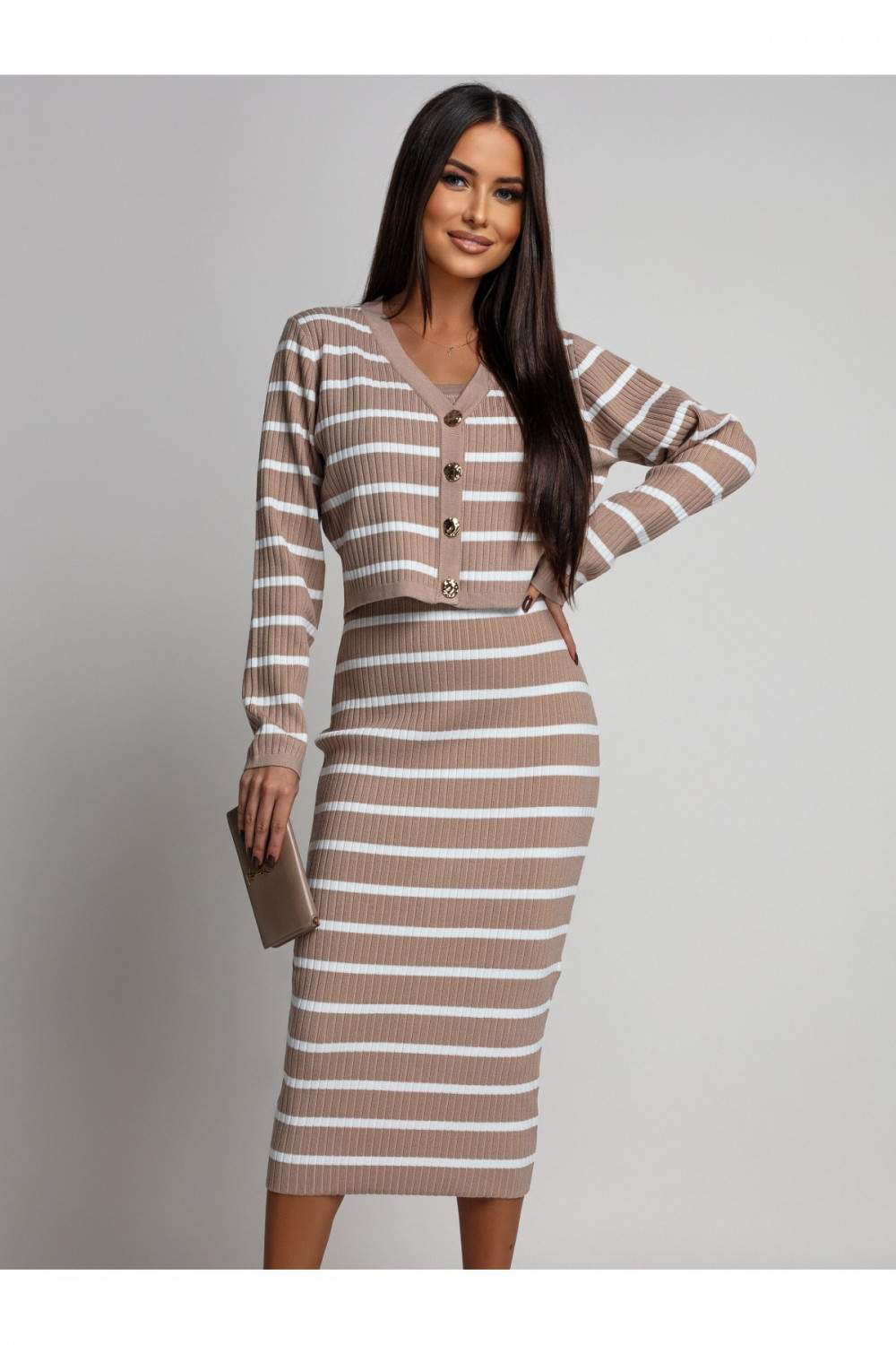Wyjątkowy dwuczęściowy komplet, który łączy kobiecy styl z ponadczasową klasyką.Prążkowany materiał pięknie przylega do sylwetki, podkreślając kształty, a poziome pasy dodają charakteru i nowoczesnego looku.