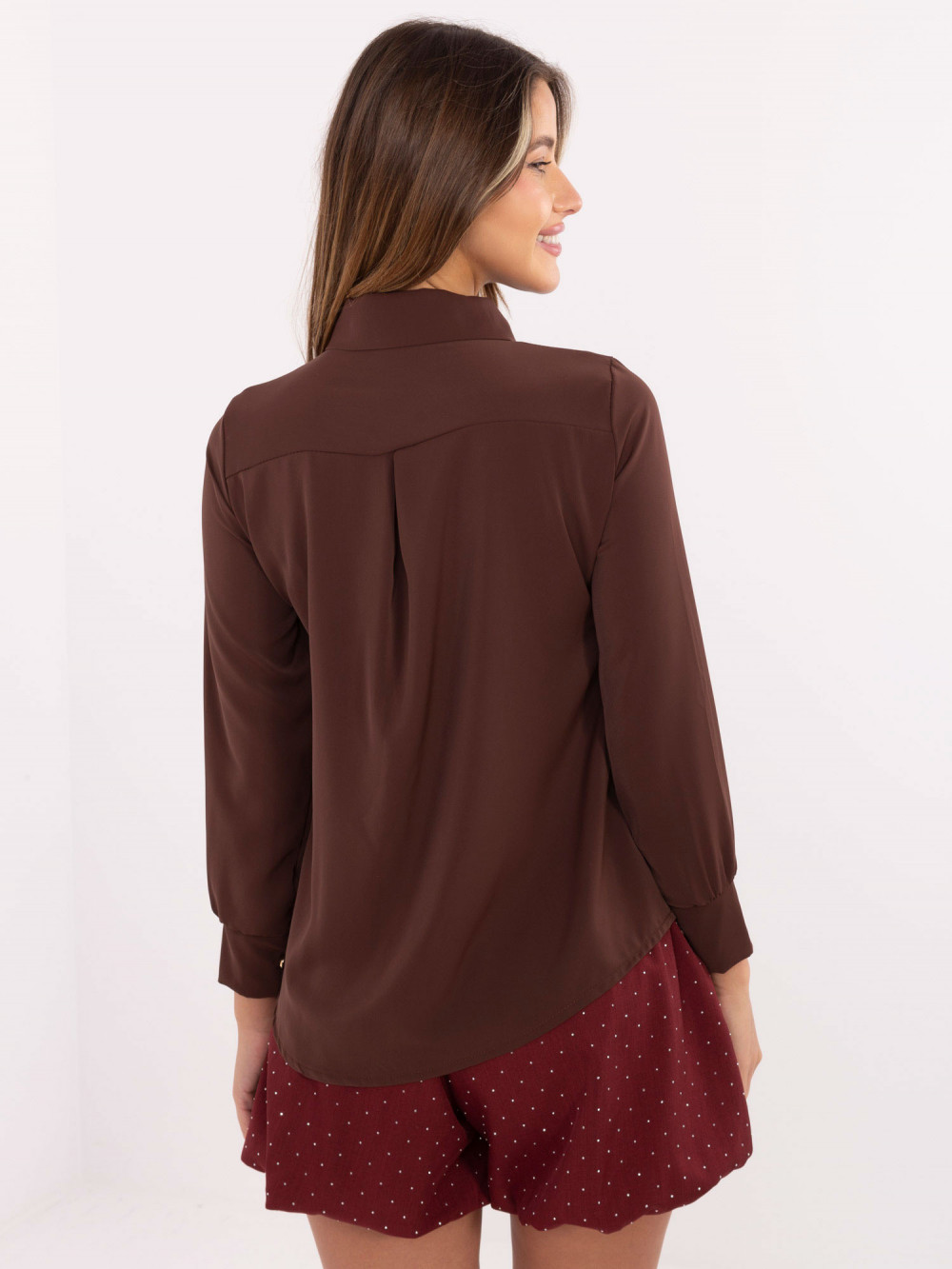 Stylowa, elegancka koszula w ciepłym odcieniu brązu to idealna propozycja na każdą porę roku. Model wykonany z przyjemnego w dotyku materiału pięknie układa się na sylwetce, zapewniając komfort noszenia przez cały dzień.Koszula ma klasyczny kołnierzyk, delikatne marszczenia przy rękawach oraz praktyczną kieszonkę na piersi. Złote guziki dodają jej subtelnej elegancji i podkreślają kobiecy charakter.