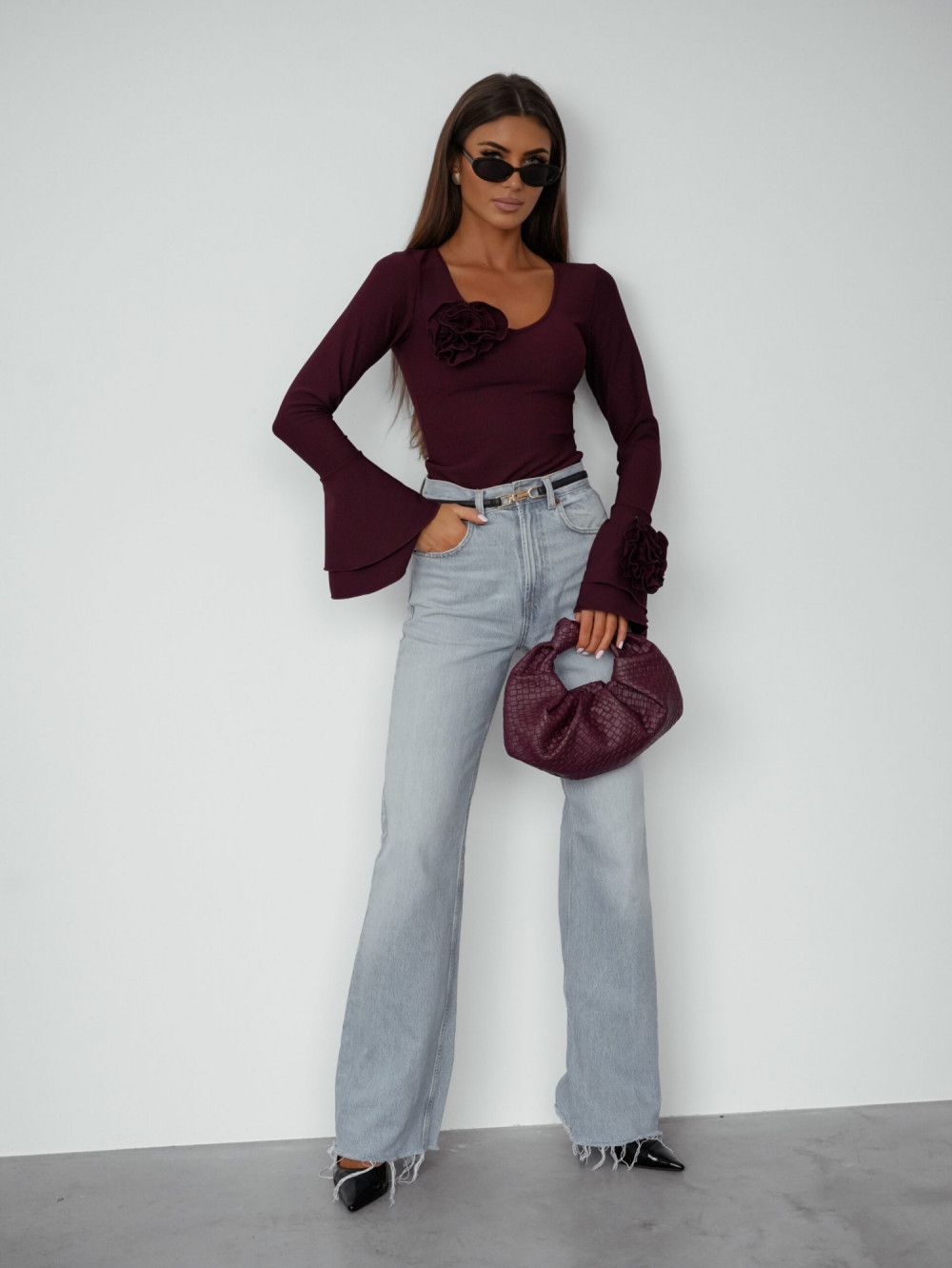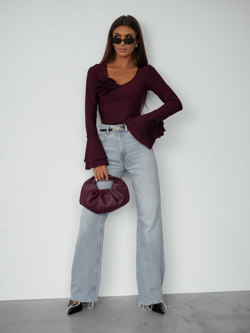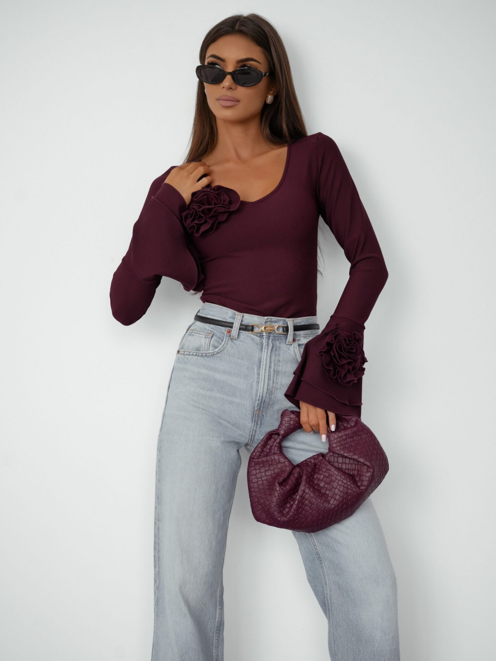 Bluzka damska z falbanami.Bluzka uszyta z elastycznego materiału, idealnie dopasowująca się do sylwetki. Model z rozszerzanymi rękawami zakończonymi falbaną. Dodatkowo wyposażona w ozdobne róże na agrafkach – można je dowolnie przepinać lub nosić bez nich.