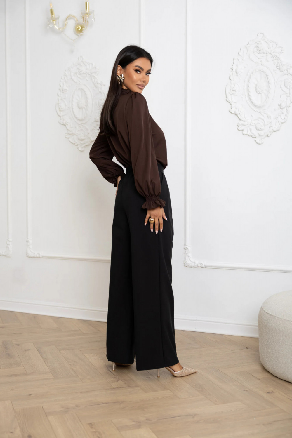 Stylowa, kobieca bluzka o swobodnym kroju, wykonana z lekkiego, delikatnie lejącego się materiału. Dekolt wykończony subtelną stójką z falbanką i ozdobnym wiązaniem dodaje całości uroku i elegancji. Długie rękawy zakończone gumką oraz delikatnymi falbankami podkreślają romantyczny charakter modelu.To ponadczasowy fason, który świetnie sprawdzi się zarówno w stylizacjach do pracy, jak i na co dzień.