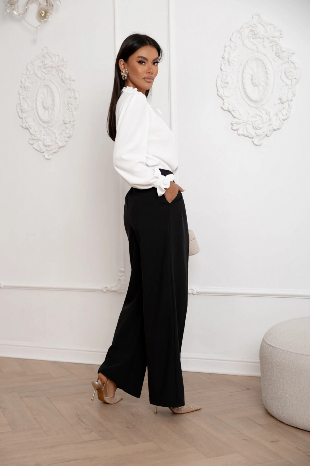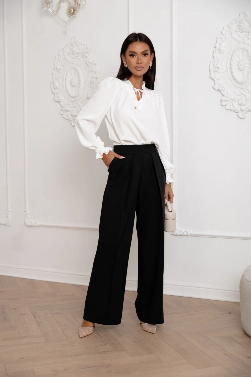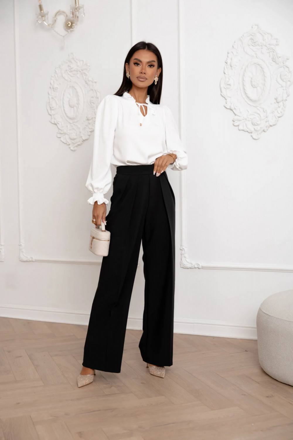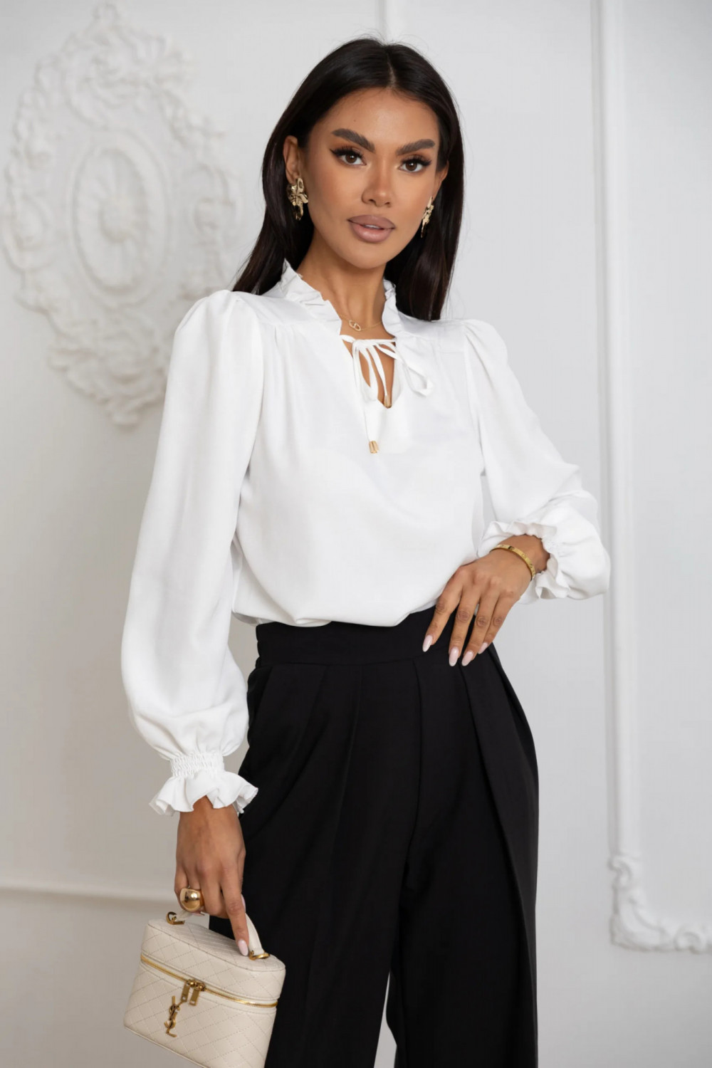 Stylowa, kobieca bluzka o swobodnym kroju, wykonana z lekkiego, delikatnie lejącego się materiału. Dekolt wykończony subtelną stójką z falbanką i ozdobnym wiązaniem dodaje całości uroku i elegancji. Długie rękawy zakończone gumką oraz delikatnymi falbankami podkreślają romantyczny charakter modelu.To ponadczasowy fason, który świetnie sprawdzi się zarówno w stylizacjach do pracy, jak i na co dzień.