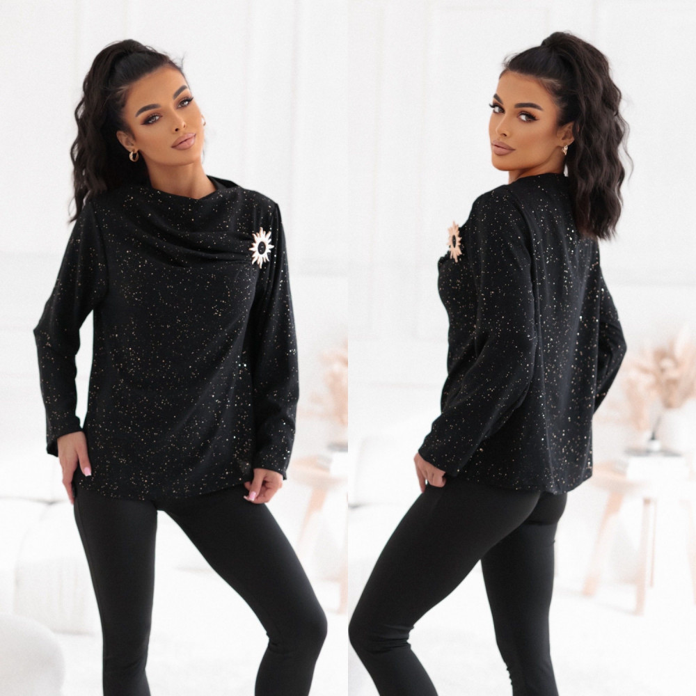 Bluzka Sparkle Charm Czarna to elegancka propozycja, która łączy klasykę z subtelnym blaskiem. Wykonana z przyjemnego w dotyku materiału, ozdobiona drobnymi, połyskującymi akcentami, pięknie rozświetla stylizację. Delikatne drapowanie w okolicy dekoltu dodaje jej szyku, a dekoracyjna aplikacja w formie efektownej broszki nadaje luksusowego wykończenia.