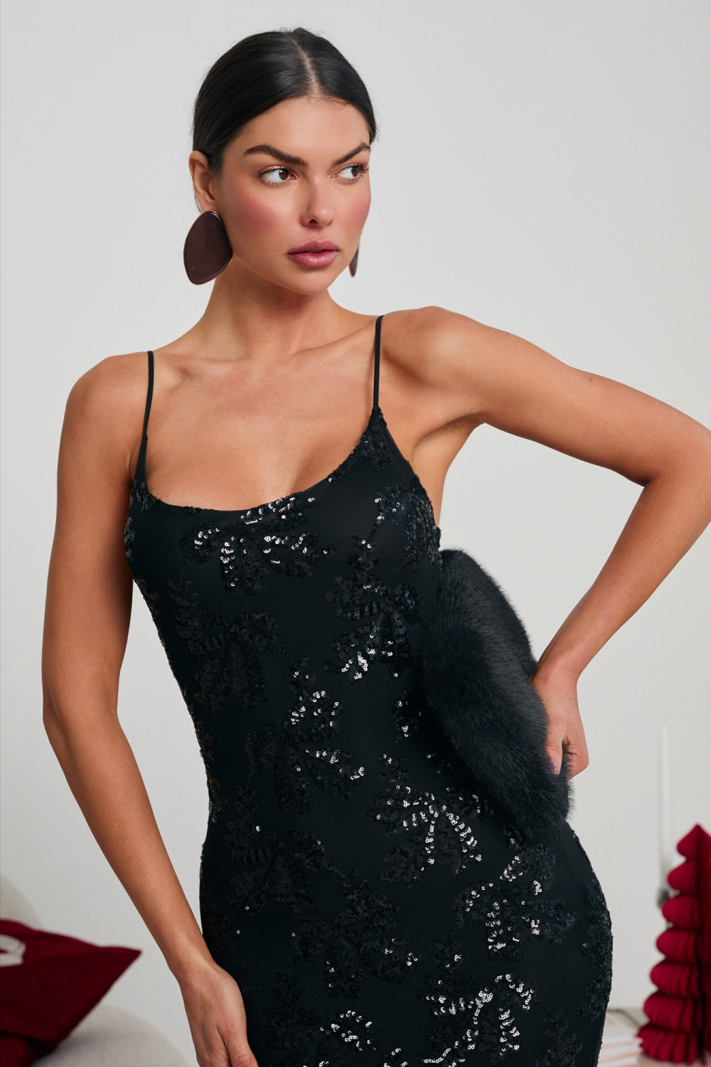 Sukienka midi o dopasowanym kroju, ozdobiona cekinowymi kwiatami, które tworzą elegancki, przestrzenny wzór na całej długości. Cienkie ramiączka i subtelnie zaokrąglony dekolt podkreślają linię ramion, a elastyczna tkanina pięknie układa się na sylwetce. To efektowna propozycja na wieczorne wyjścia, w której połyskujące aplikacje dodają wyrafinowanego blasku i sprawiają, że całość prezentuje się wyjątkowo.