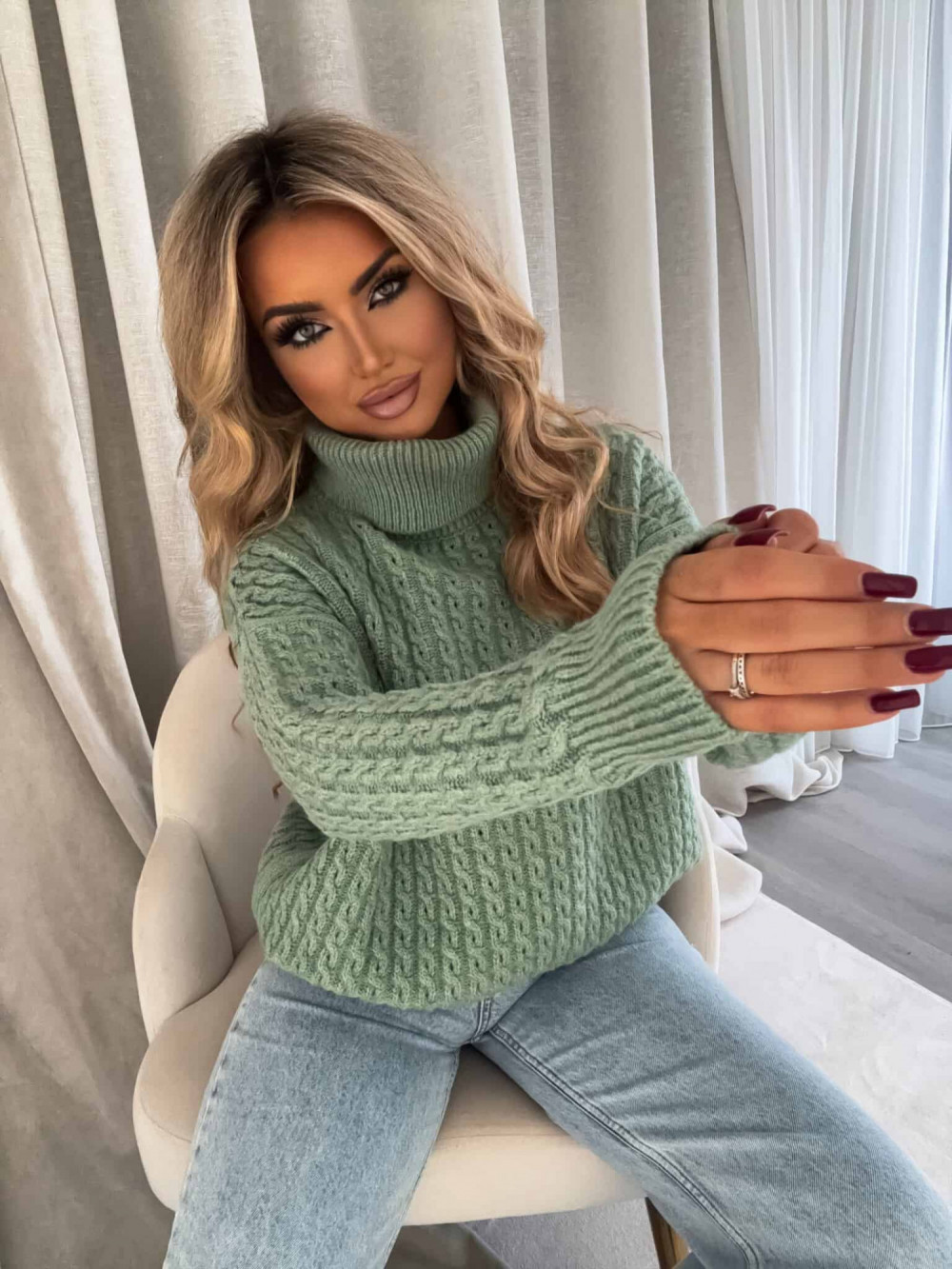 Sweter z golfem, wkładany przez głowę, na długi rękaw z ciekawym splotem. Bardzo ciepły.