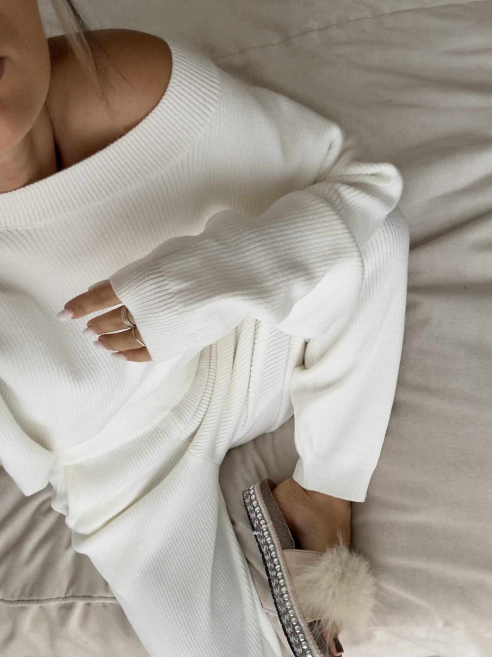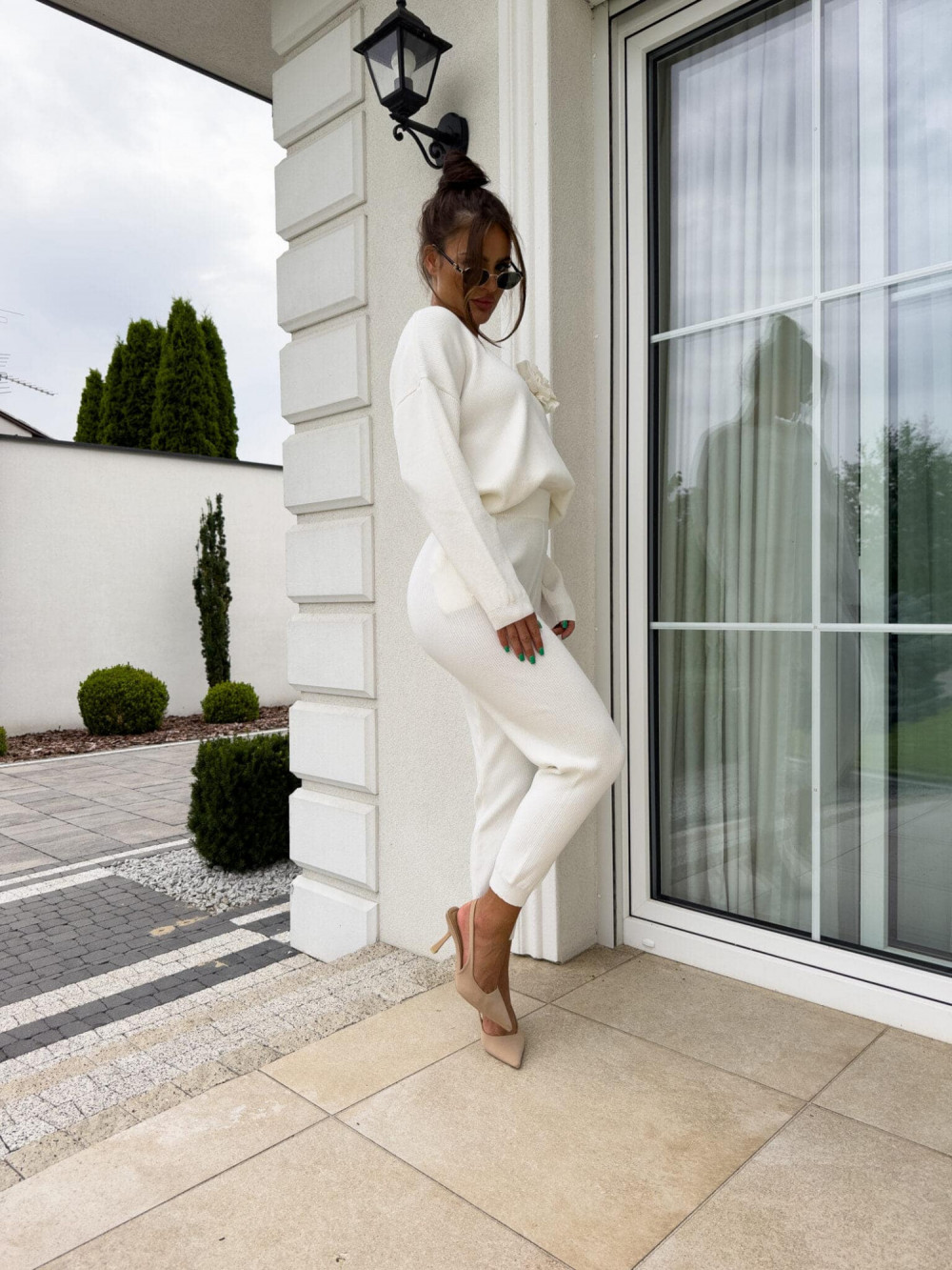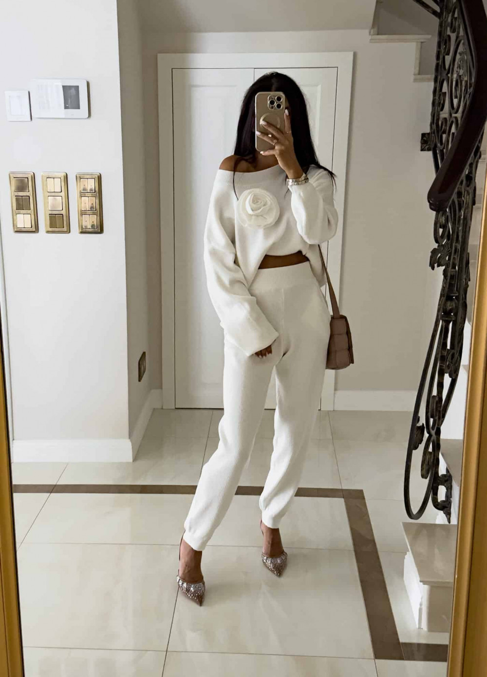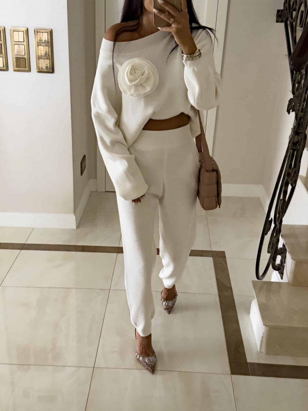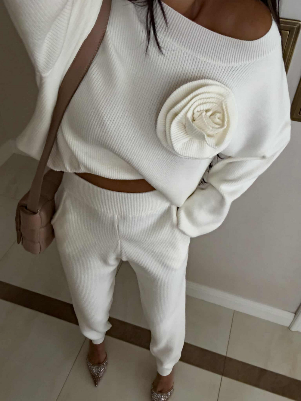 Komplet Delani Long składający się z bluzy sweterkowe z długim rękawem oraz długich spodni z gumką w pasie. Kwiat jest odpinany.