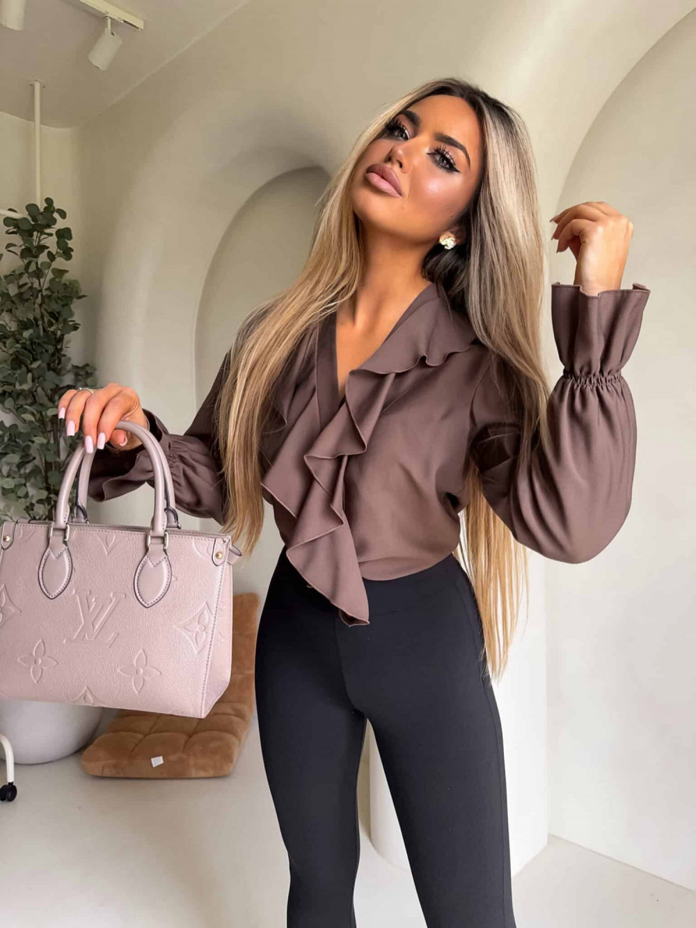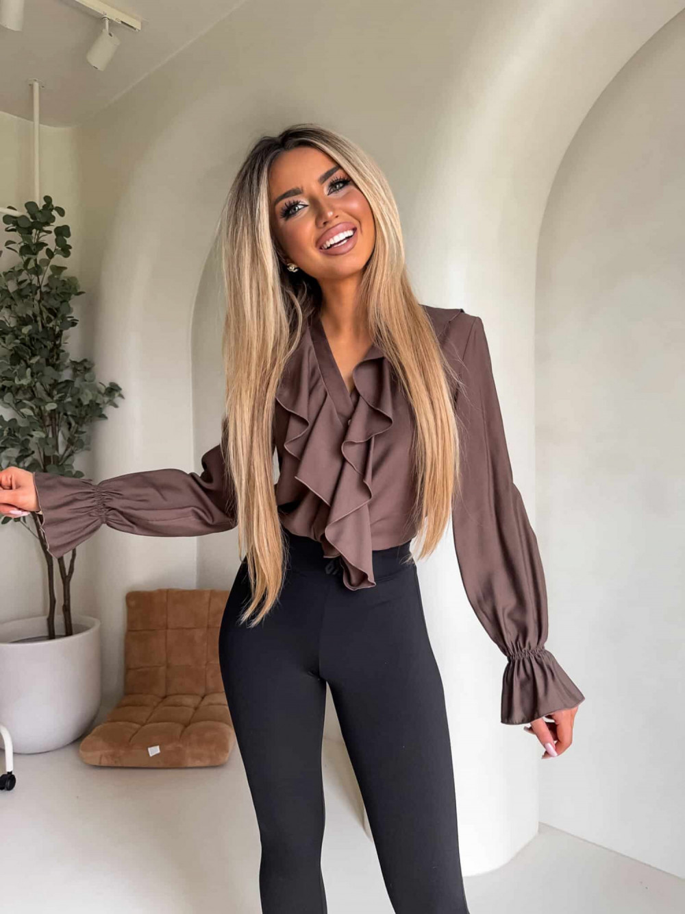 Elegancka i kobieca bluzka wykonana z gładkiego, satynowego materiału. Model wyróżnia się ozdobnymi falbanami biegnącymi przez środek oraz delikatnie okalającymi dekolt. Długie rękawy zakończone są szerokimi, elastycznymi mankietami, które tworzą efektowne, lekkie bufki. Fason jest lekko dopasowany, a jednocześnie swobodny, dzięki czemu bluzka doskonale układa się na sylwetce i zapewnia komfort noszenia.