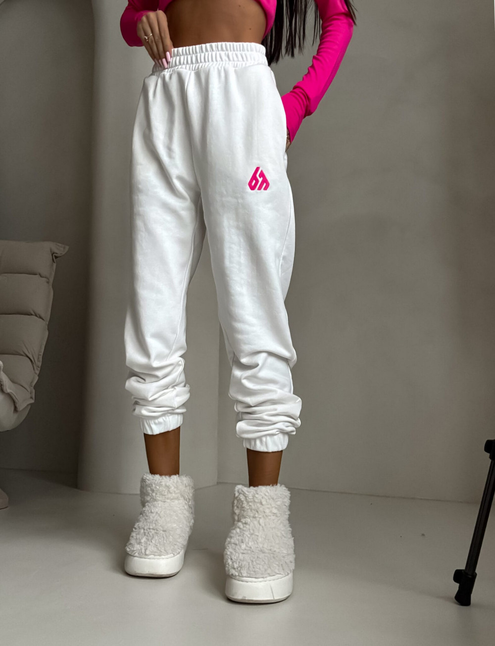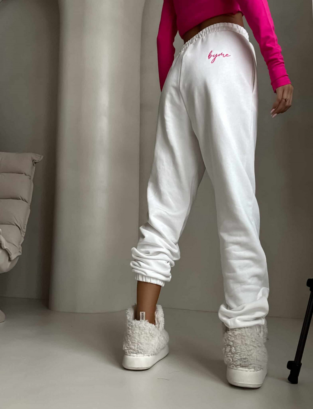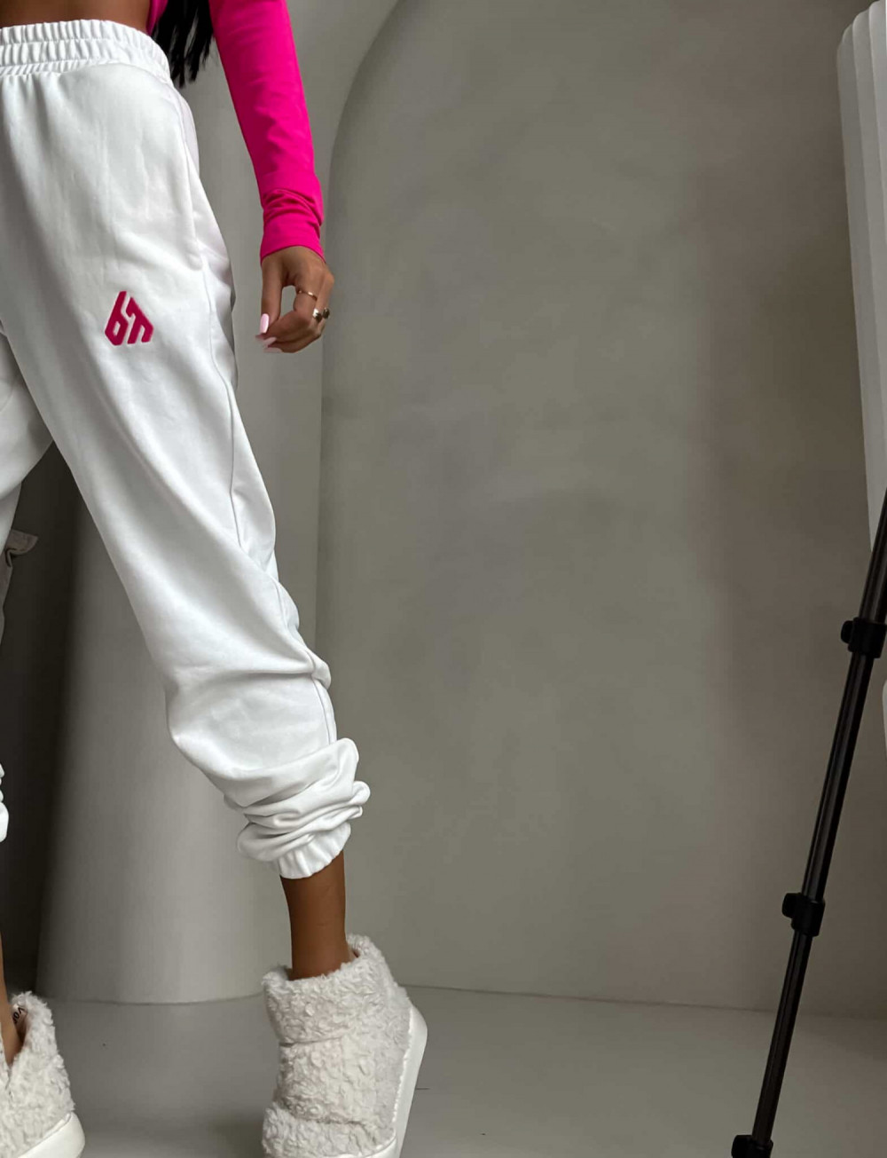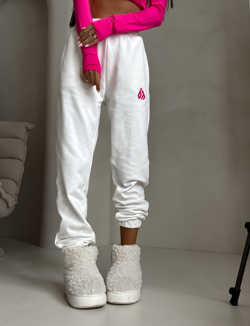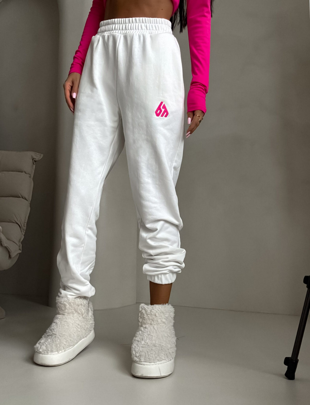 Spodnie dresowe – dopasowane, z elastycznym pasem w talii i ściągaczami na dole nogawek. Ich krój podkreśla sylwetkę, zachowując jednocześnie pełną swobodę ruchów.