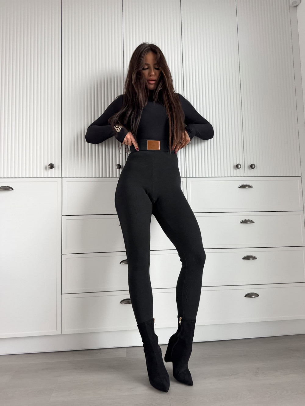 Prążkowane legginsy z najwyższej jakości materiału. Skórzana naszywka na środku.
