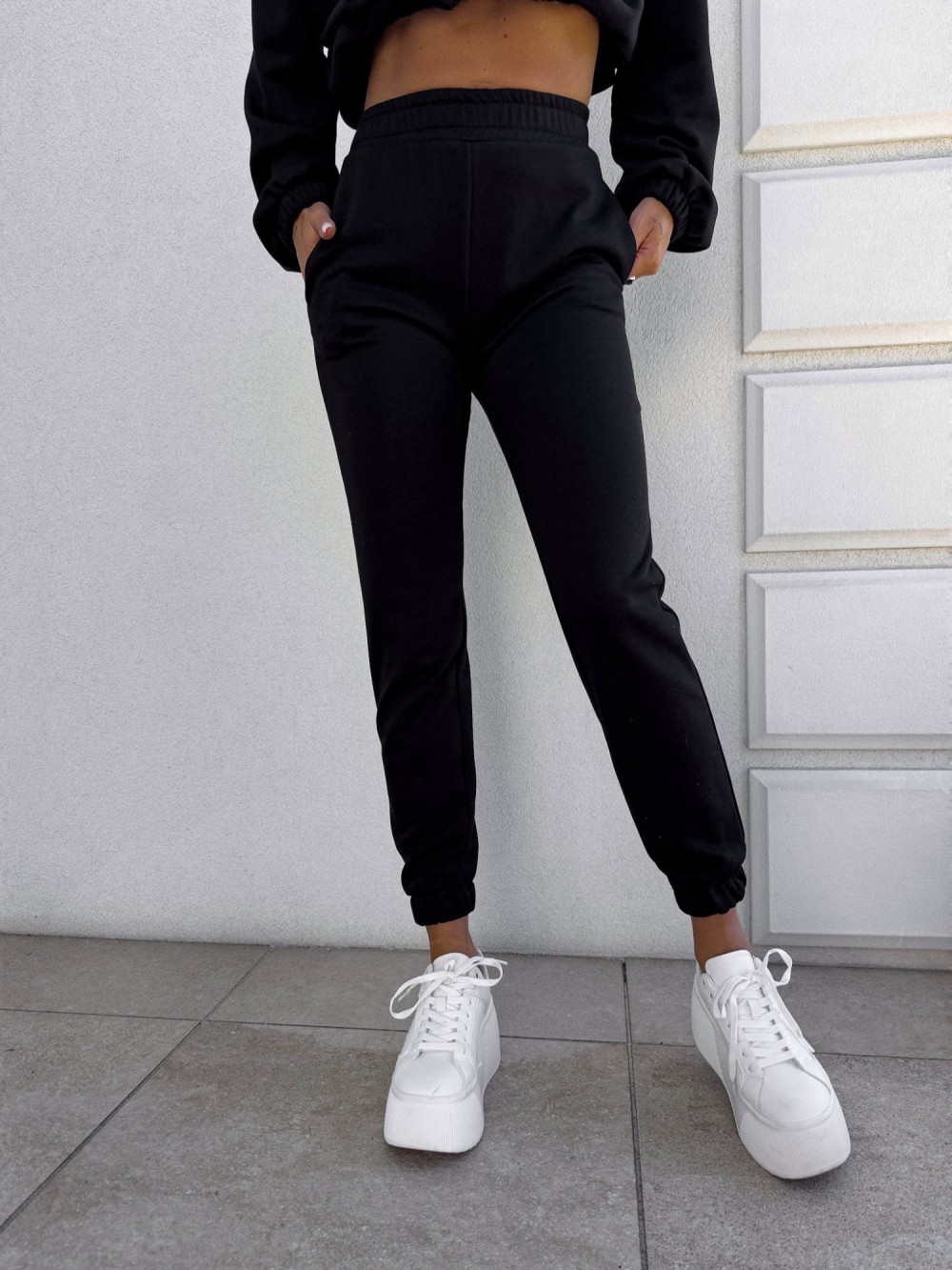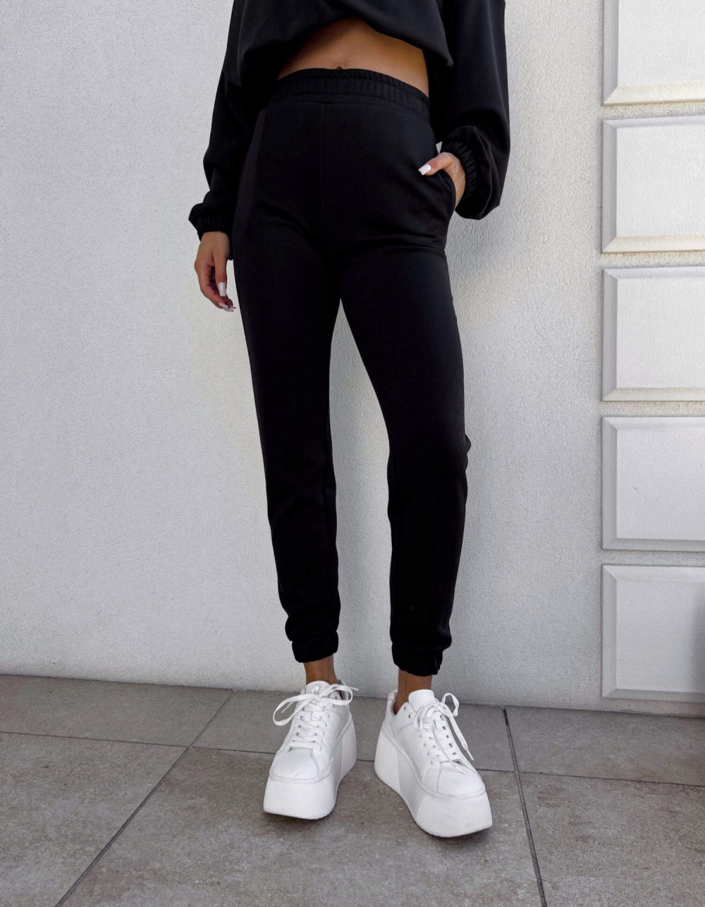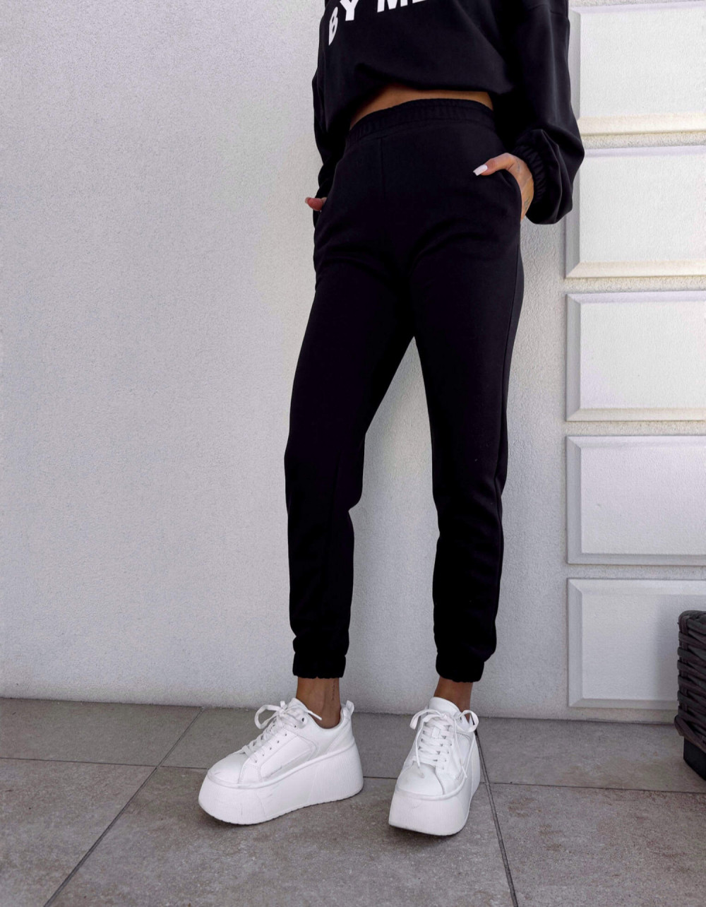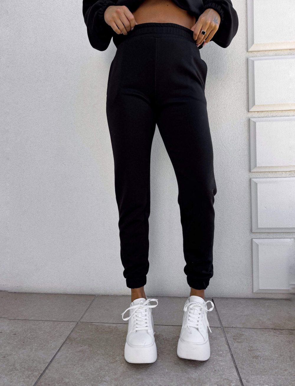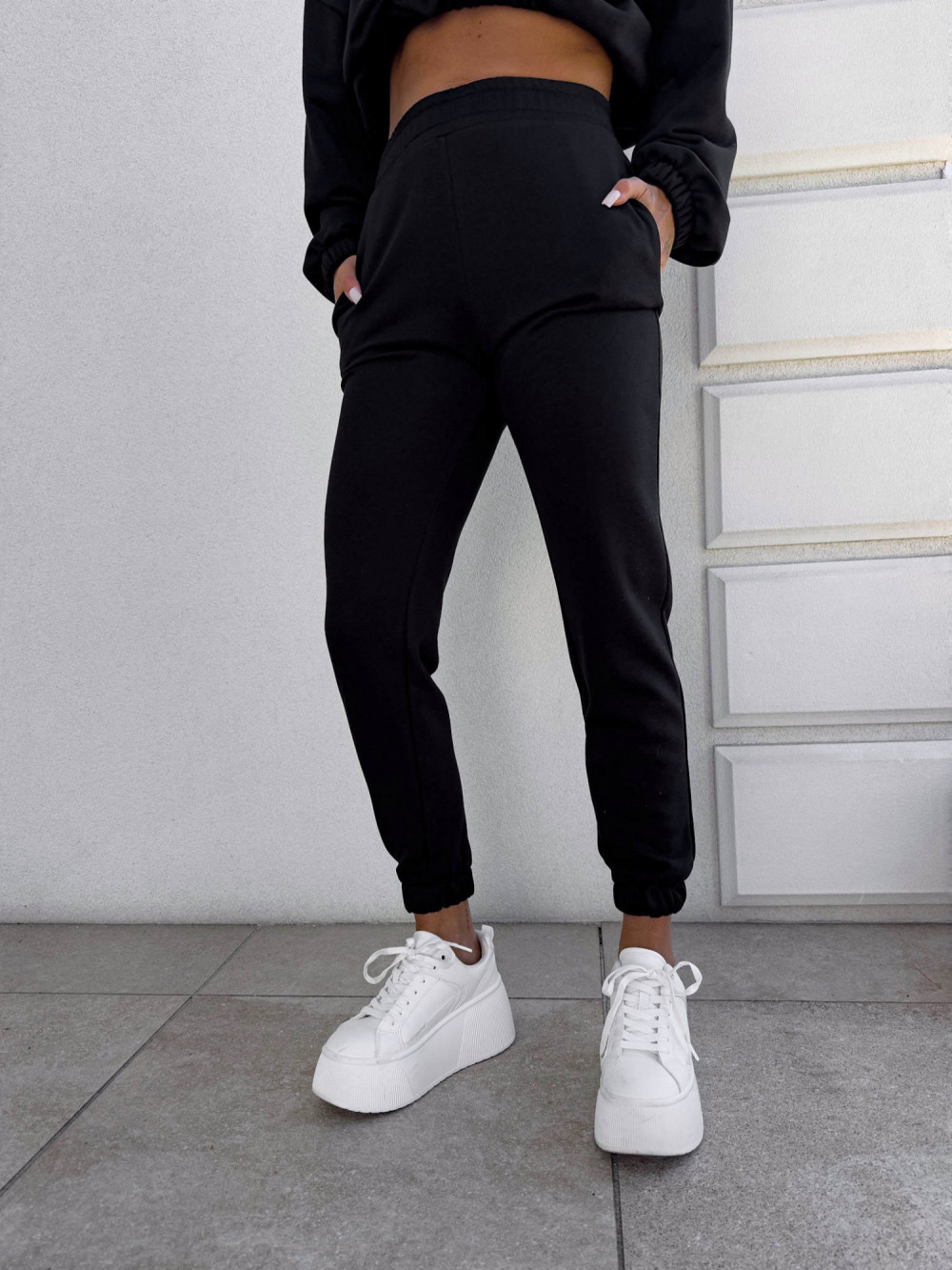 Spodnie dresowe – dopasowane, z elastycznym pasem w talii i ściągaczami na dole nogawek. Ich krój podkreśla sylwetkę, zachowując jednocześnie pełną swobodę ruchów.