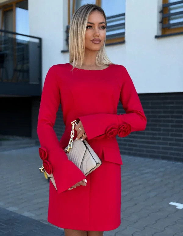 Elegancka sukienka rękawem ozdobionym kwiatem w kolorze sukienki. Model taliowany, na plecach zapinana na kryty zamek.Na przodzie modne kwiatki.Fason pięknie podkreśla kobiecą sylwetkę i dodaje elegancji. Sukienka idealna na wszelkiego typu imprezy okolicznościowe, spotkani w pracy, wieczorne wyjście.