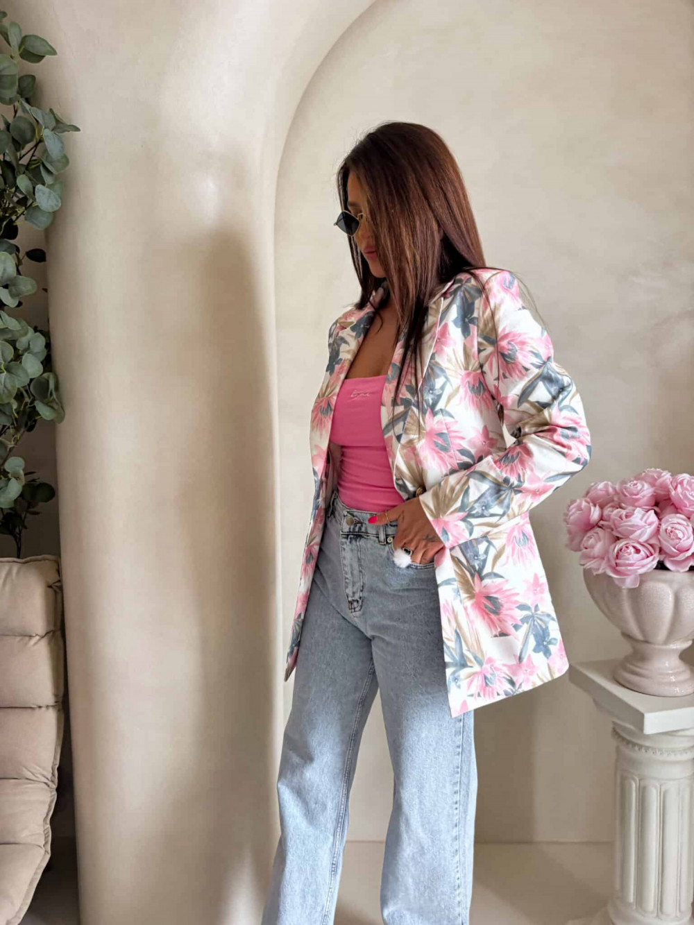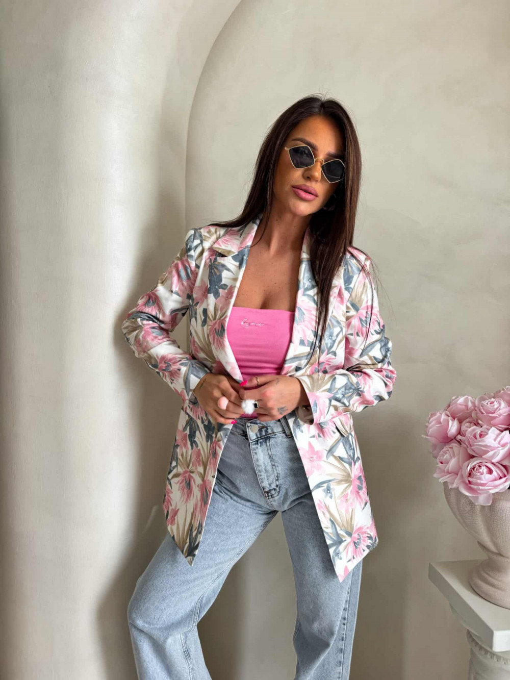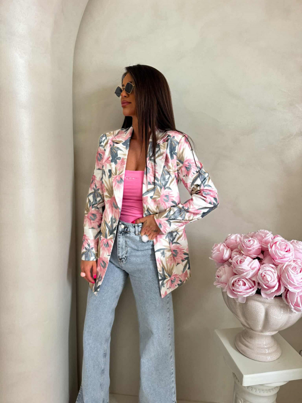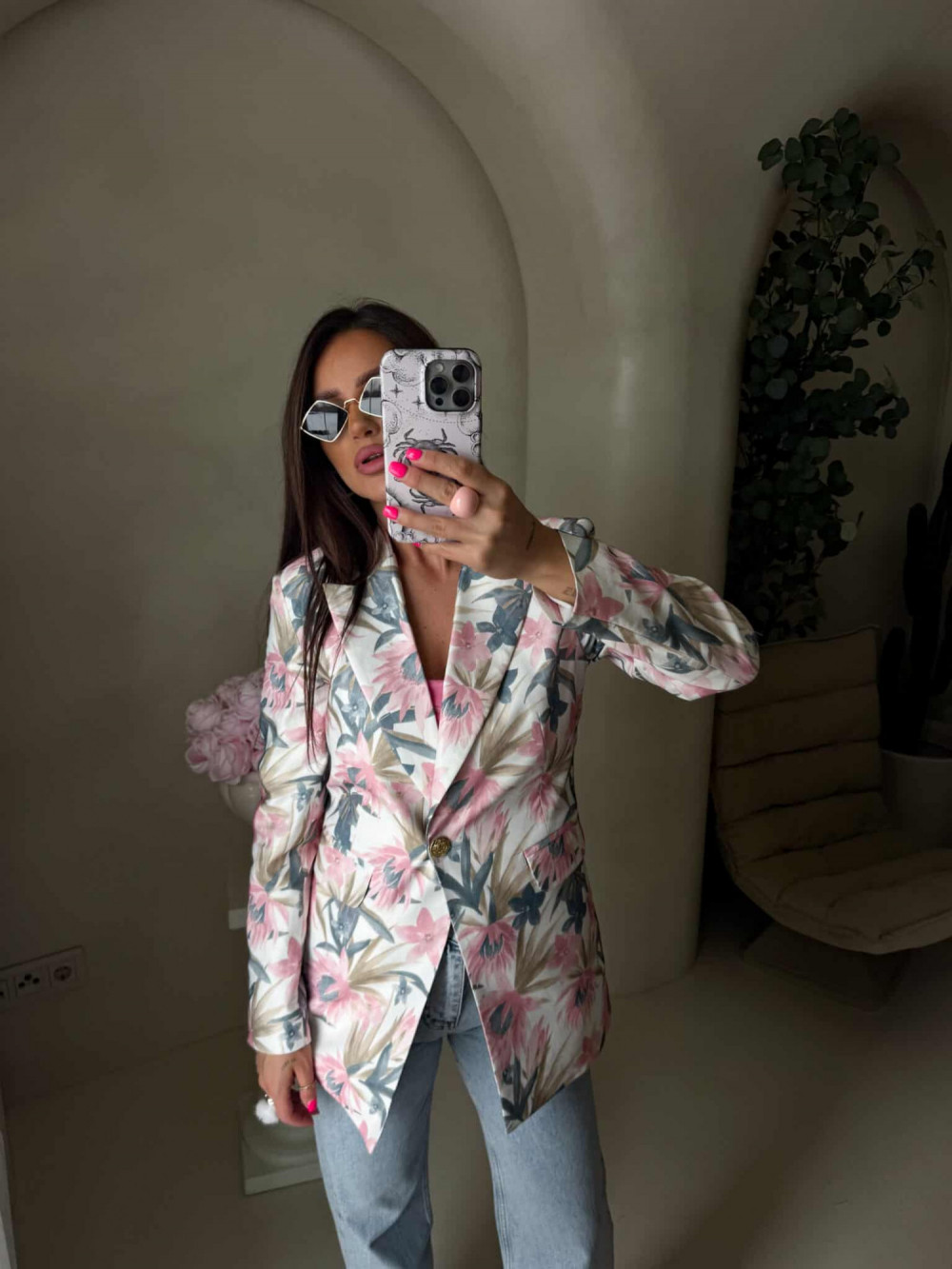 Marynarka o klasycznym, eleganckim fasonie. Jest delikatnie dopasowana w talii, dzięki czemu subtelnie podkreśla sylwetkę. Posiada jednorzędowe zapięcie na jeden guzik oraz klasyczne klapy o średniej szerokości. Po bokach znajdują się dwie kieszenie z patkami. Długość marynarki sięga poniżej bioder, co zapewnia eleganckie proporcje. Długie rękawy mają prosty krój.