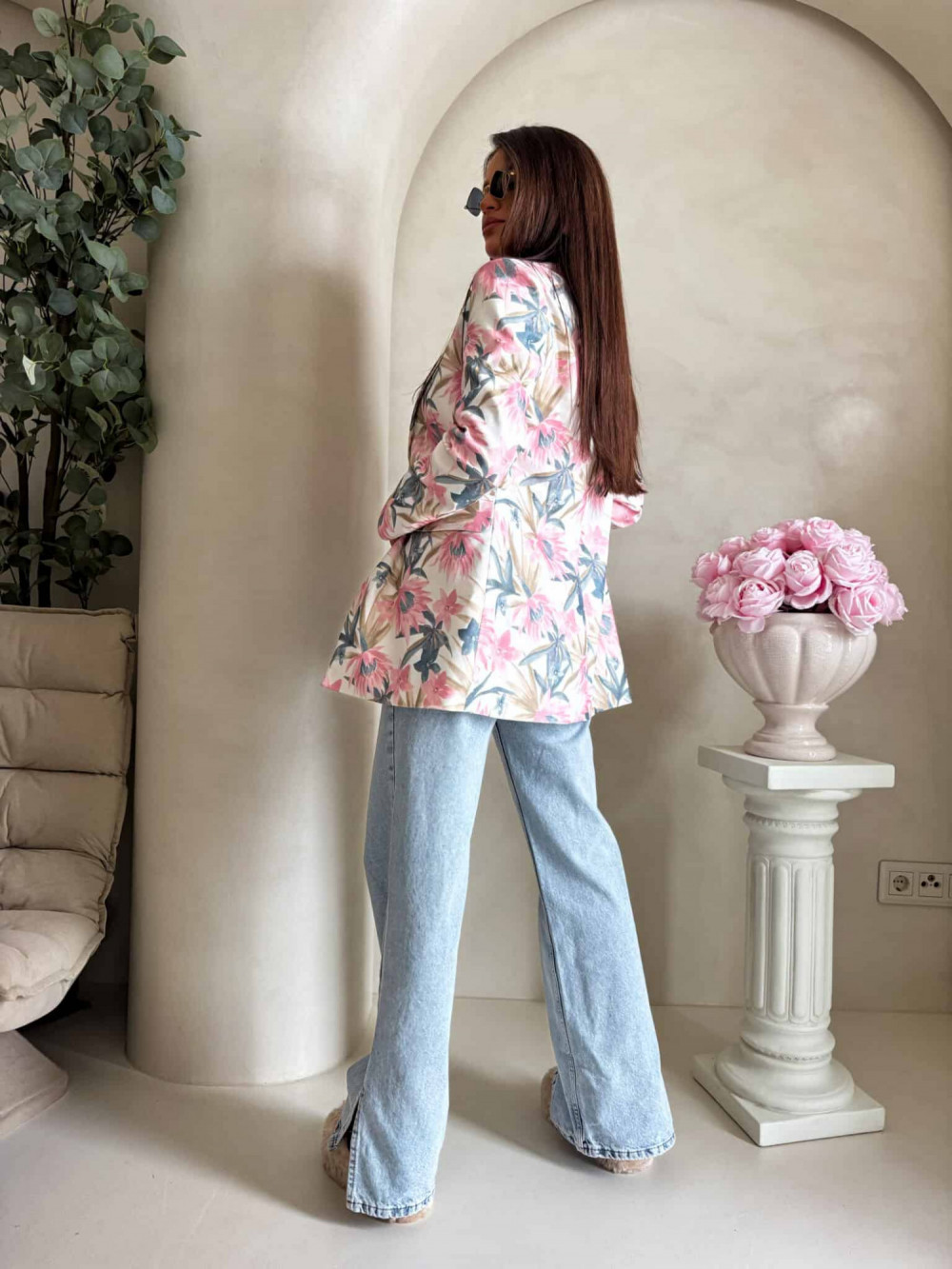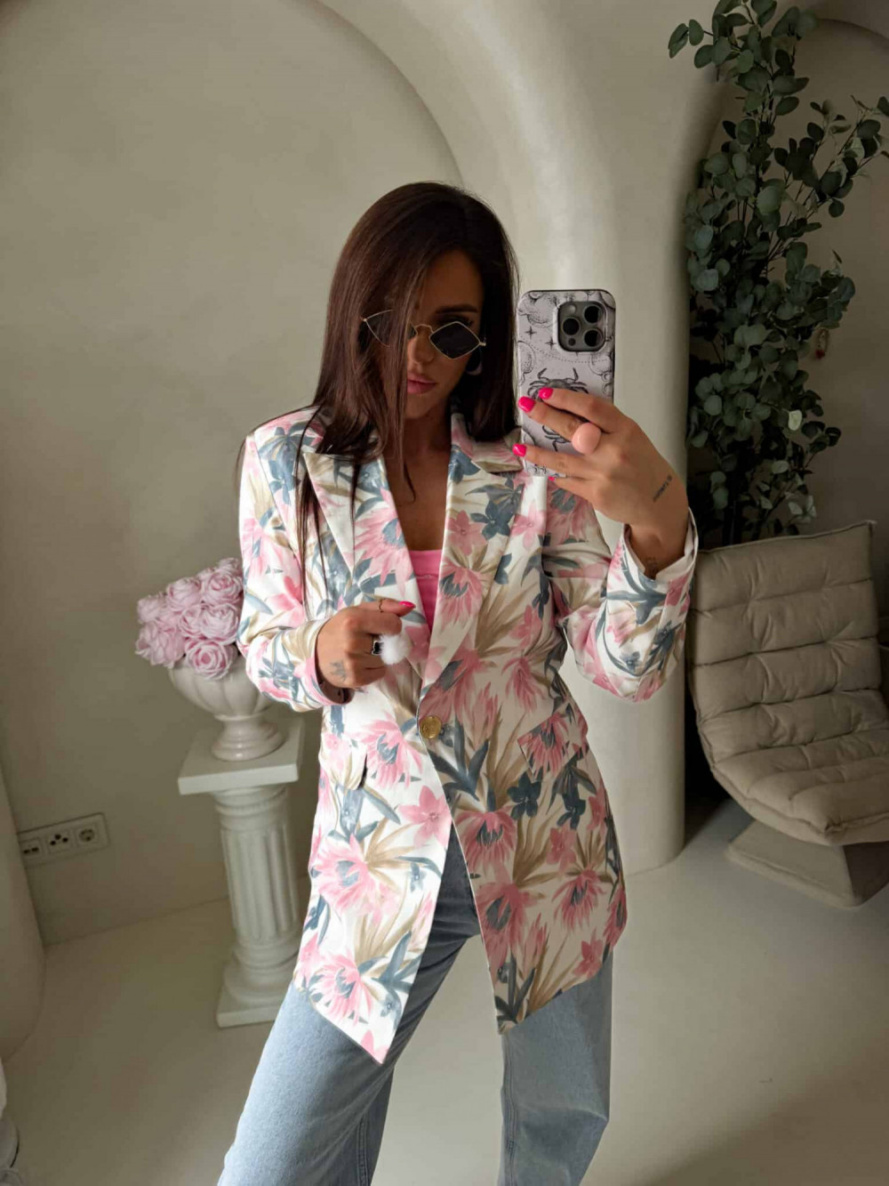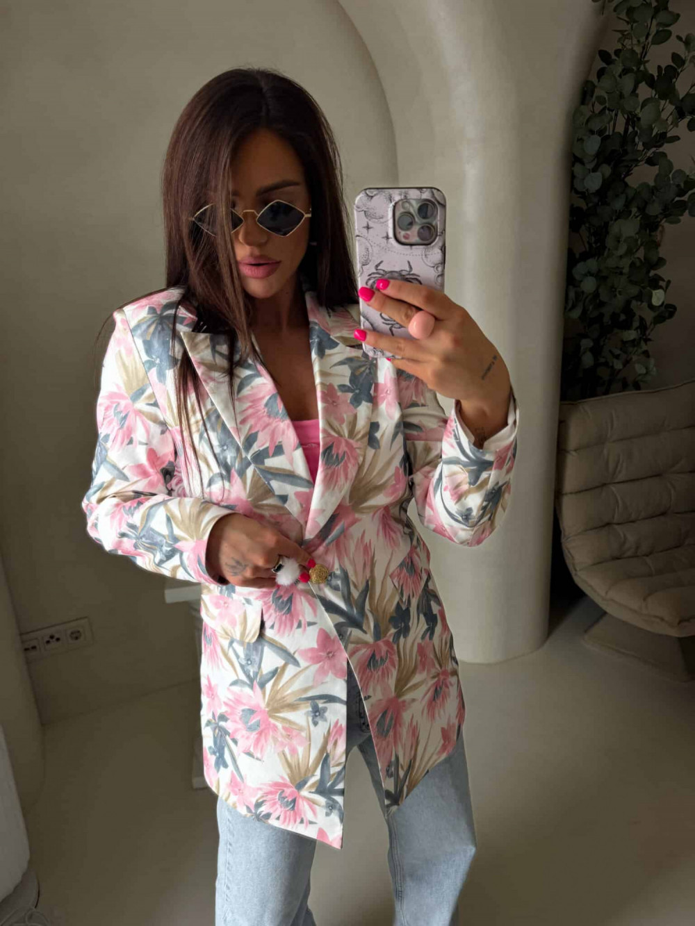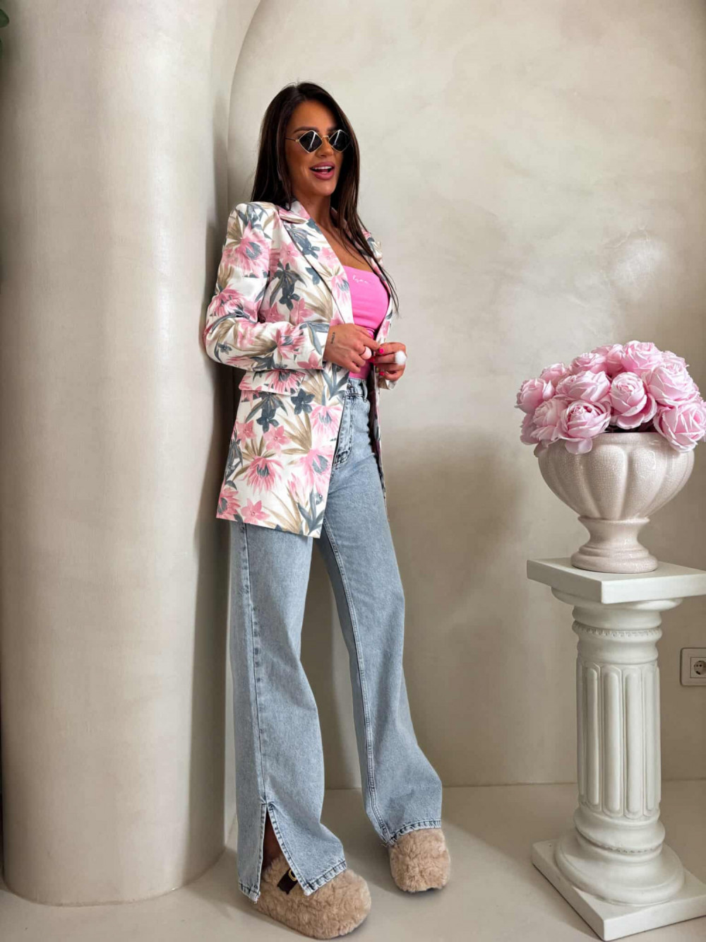 Marynarka o klasycznym, eleganckim fasonie. Jest delikatnie dopasowana w talii, dzięki czemu subtelnie podkreśla sylwetkę. Posiada jednorzędowe zapięcie na jeden guzik oraz klasyczne klapy o średniej szerokości. Po bokach znajdują się dwie kieszenie z patkami. Długość marynarki sięga poniżej bioder, co zapewnia eleganckie proporcje. Długie rękawy mają prosty krój.