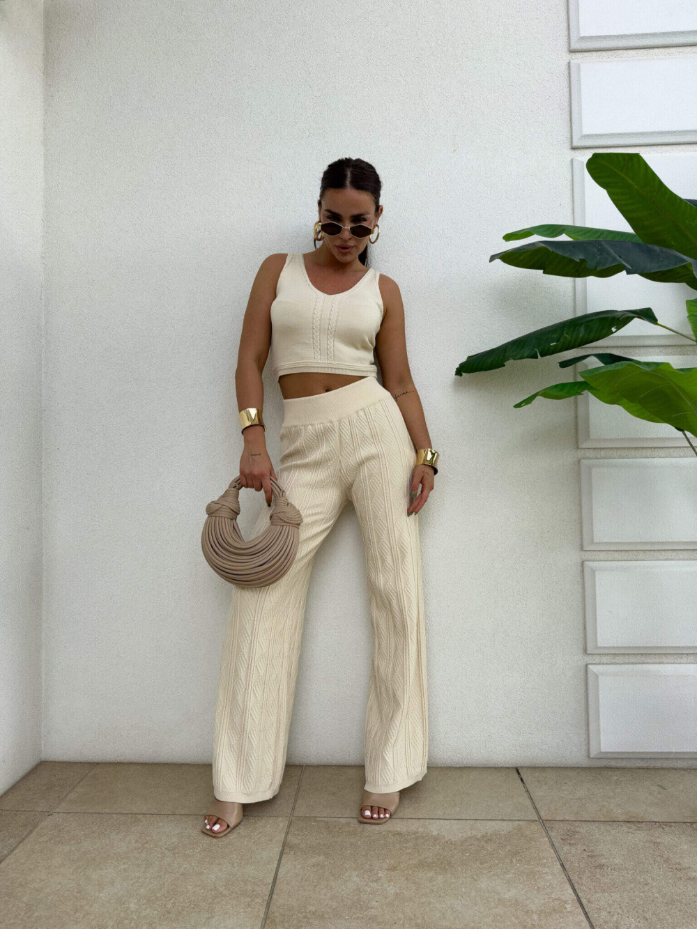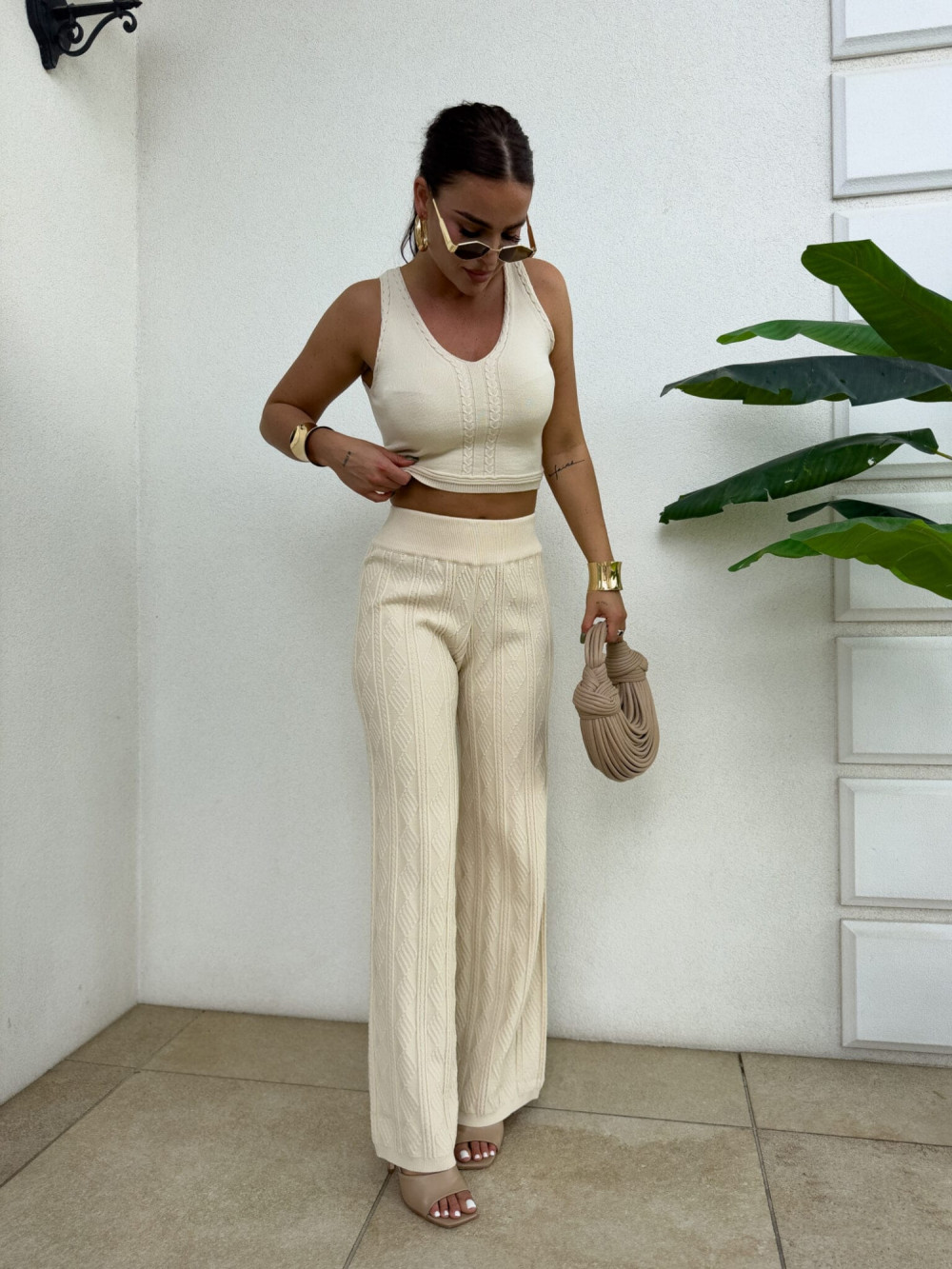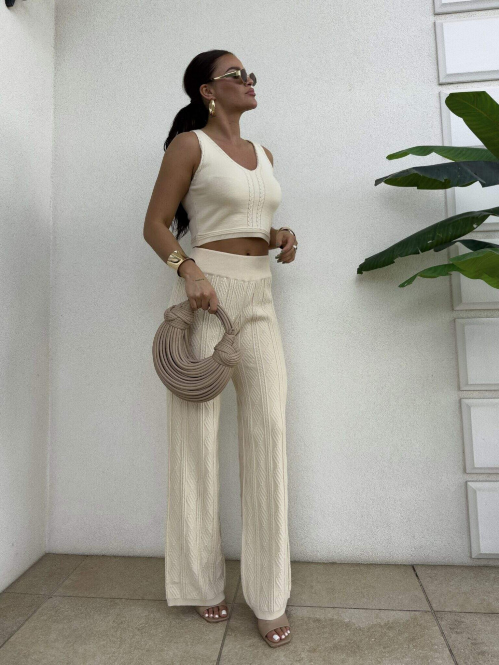 Komplet sweterkowy dzianinowy składający się z topu i spodni z szeroką nogawką. Wykonane z miękkiej dzianiny, zapewniają komfort i wygodę. Cechą wyróżniającą tego kompletu jest luźny, swobodny charakter.