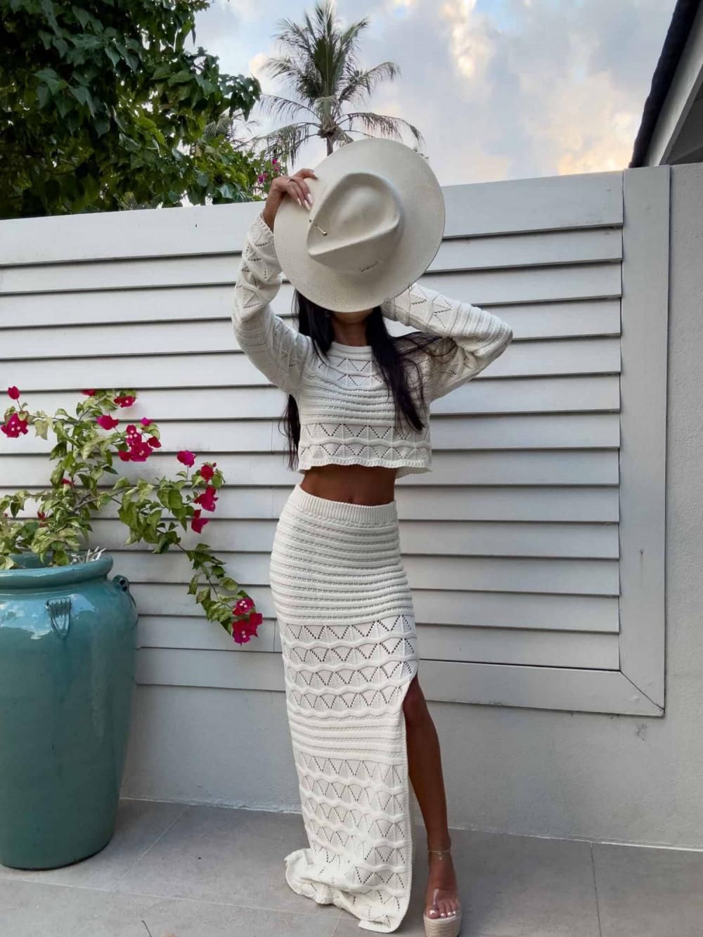 Dzianinowy komplet z ażurowym wzorem. Zestaw składa się z krótkiego swetra z długim rękawem oraz dopasowanej spódnicy maxi z wysokim stanem i efektownym rozcięciem na nodze. Kobiecy, stylowy komplet idealny na letnie stylizacje,
