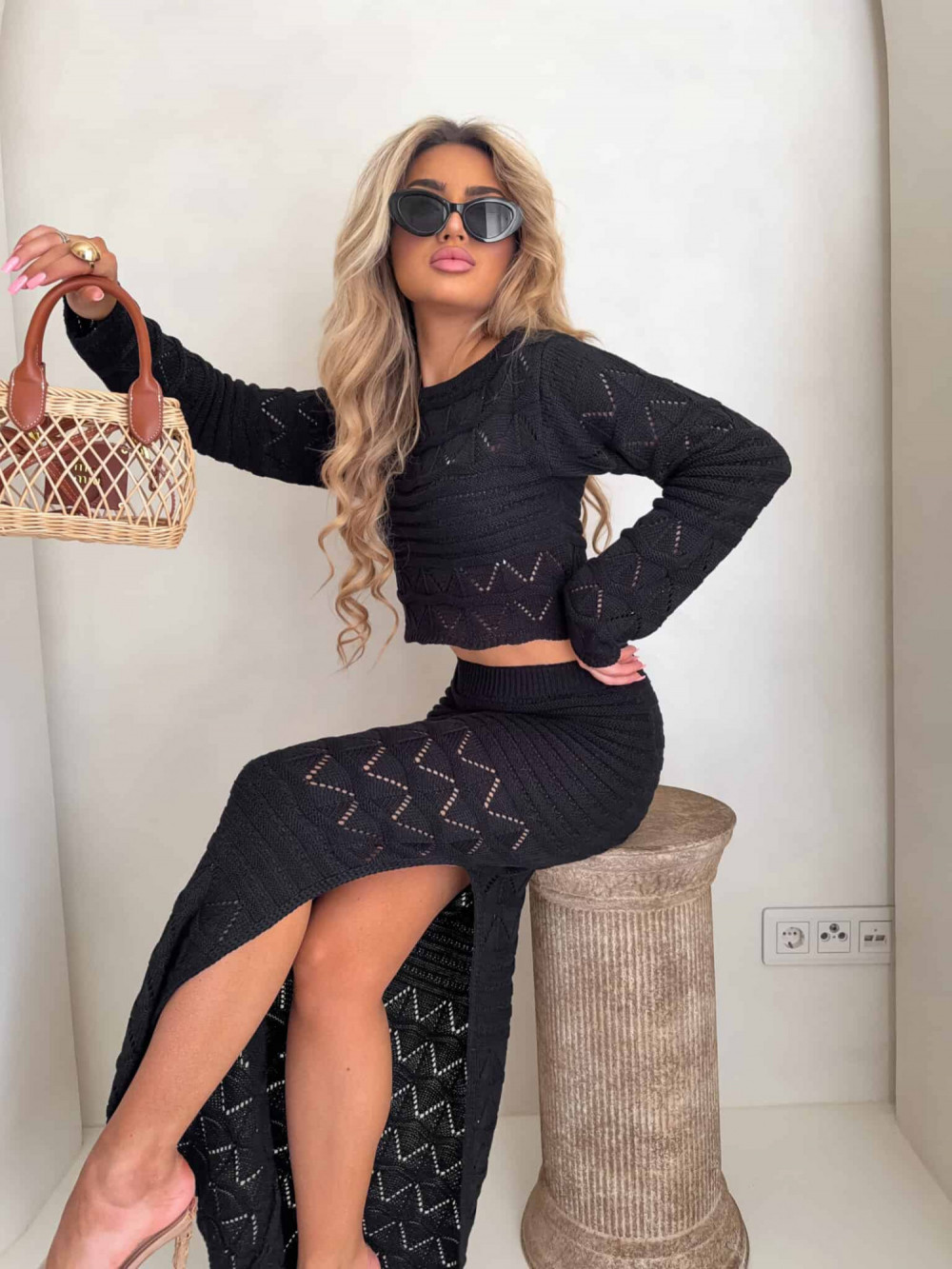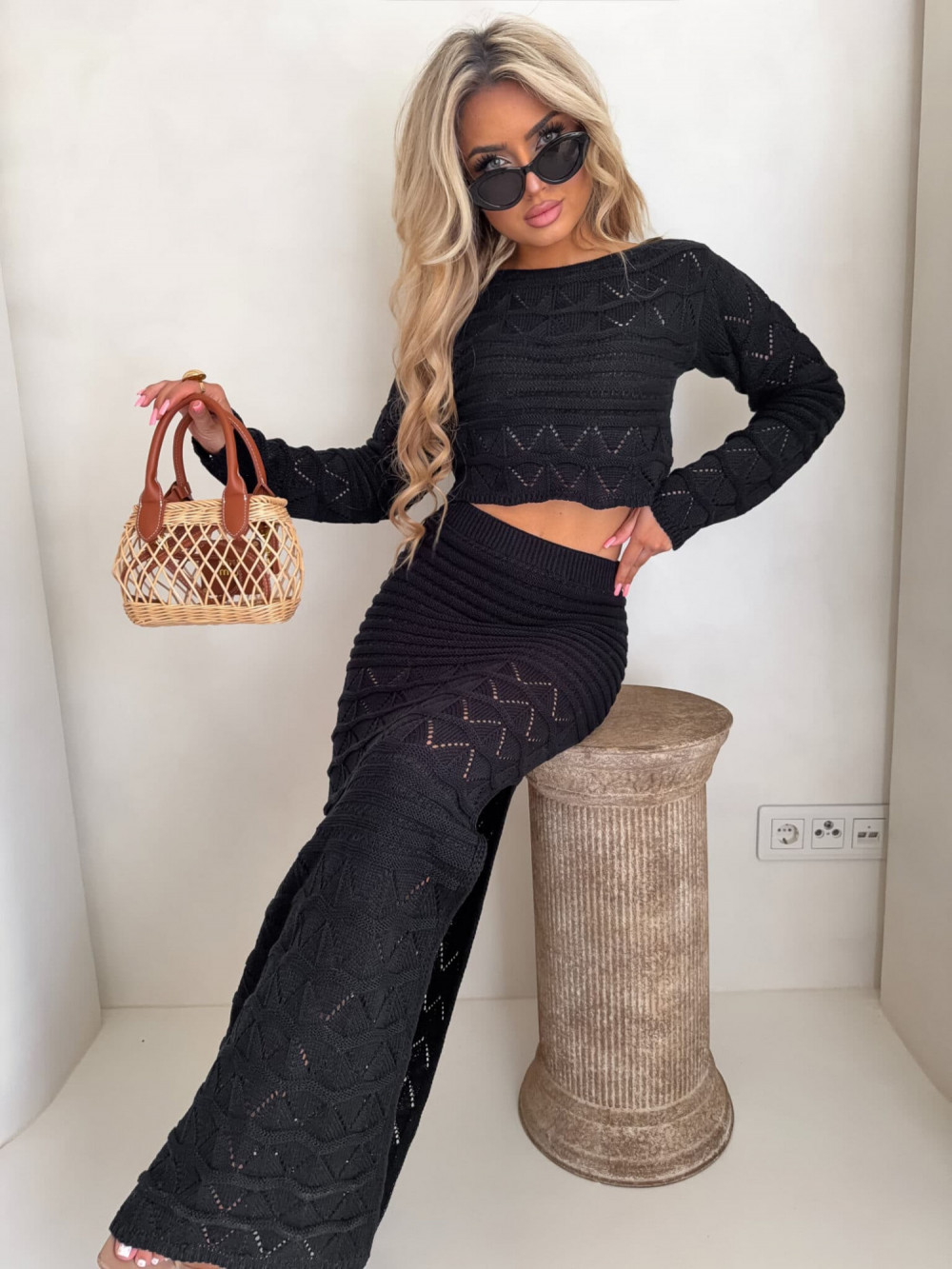 Dzianinowy komplet z ażurowym wzorem. Zestaw składa się z krótkiego swetra z długim rękawem oraz dopasowanej spódnicy maxi z wysokim stanem i efektownym rozcięciem na nodze. Kobiecy, stylowy komplet idealny na letnie stylizacje,